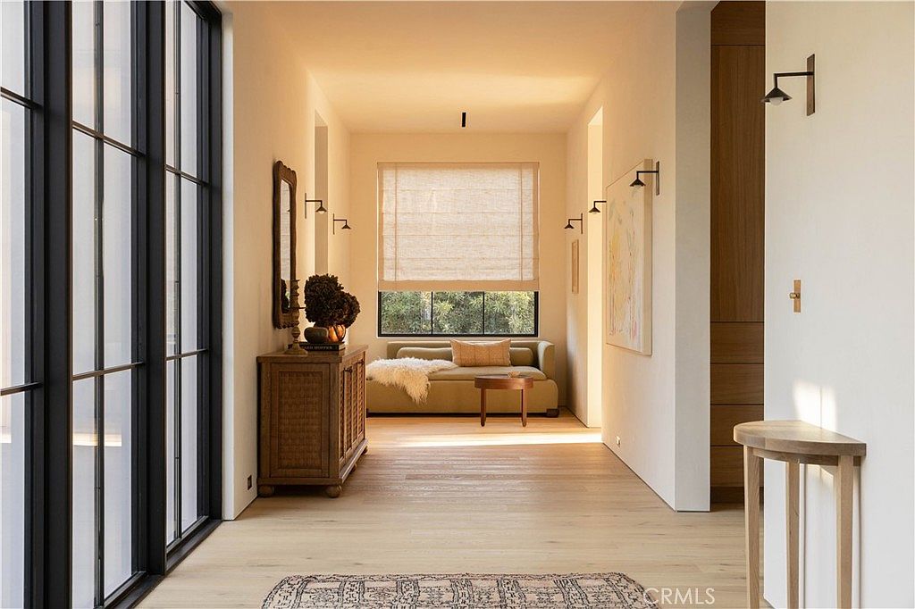 Sunlight filters through tall black-framed glass windows on the left, illuminating a hallway with pale wooden floors and creamy white walls. Warm, minimalist decor is emphasized by the simple wooden sideboard topped with art objects and a textured mirror. Sconces line the corridor, adding gentle ambient light. At the far end, a cozy seating nook features a small beige loveseat adorned with a soft throw, accompanied by a modern wooden coffee table and pillows, set in front of a window with a woven shade. Abstract artwork and subtle, natural textures contribute to a serene, inviting atmosphere.