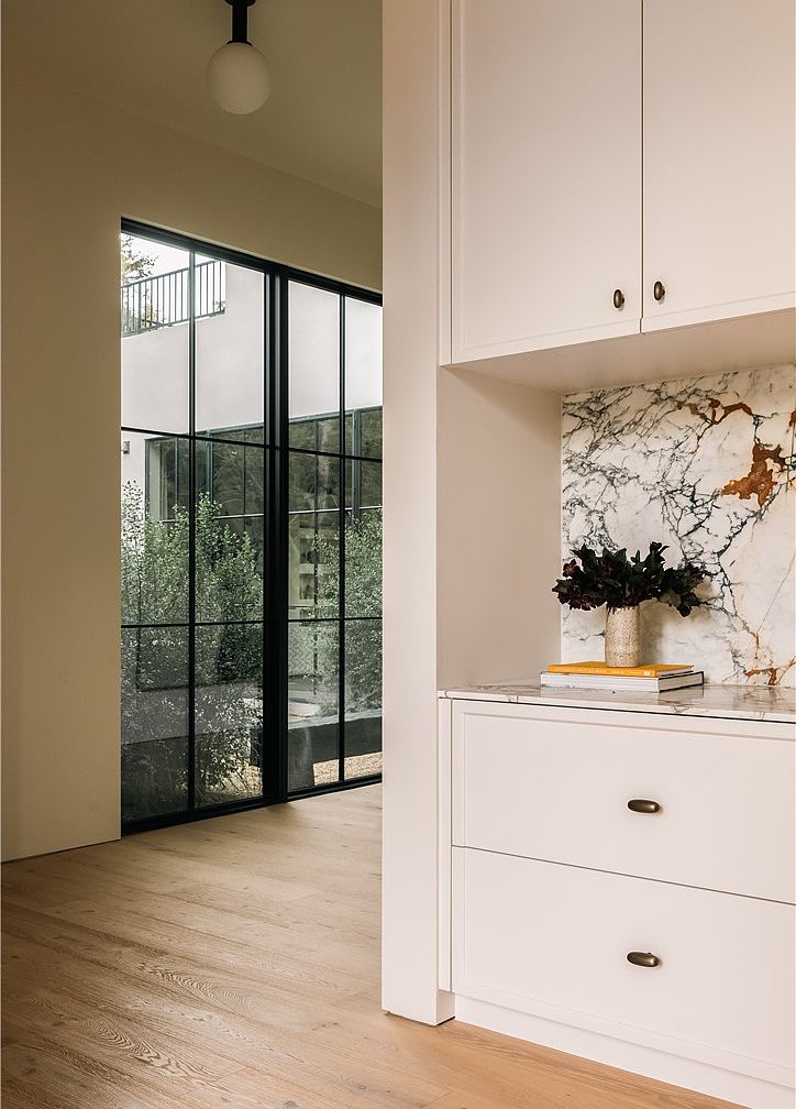 Bright and airy kitchen area with a minimalist, modern aesthetic. Light natural wood flooring extends seamlessly into an adjoining space. On the right, soft white cabinetry with simple brass knobs is paired with a luxurious marble backsplash, streaked with gray veining and touches of rust color. A vase filled with dark leafy greens and stacked books adds subtle decor, sitting atop the counter. Large floor-to-ceiling black-framed glass doors lead to an outdoor area abundant with greenery, filling the space with soft natural light. Clean lines, neutral shades, and lavish material choices define the overall sophisticated atmosphere.