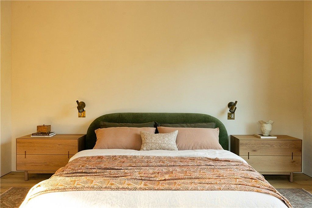 A serene bedroom features a low, plush bed with a rounded green velvet headboard centered against a soft cream wall. Two matching light wood nightstands flank the bed, each with minimalist hardware and simple decor—a small stack of books and sculptural objects. Above each nightstand is a matte black modern sconce providing symmetry and task lighting. The bedding is layered in neutral shades, including ivory, beige, and pale pink, topped with a patterned quilt in warm earth tones. The room’s ambiance feels calm and welcoming, with natural materials and muted colors enhancing the cozy, minimalist aesthetic.