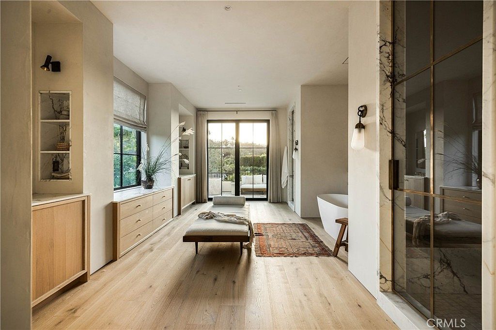 A spacious and serene bathroom with natural light streaming through large black-framed windows and doors that likely lead to a private outdoor terrace. Warm-toned wood flooring and cabinetry add a soft, organic feel. A freestanding white bathtub sits on the right, accompanied by a wooden stool and a vintage-style rug, blending modern comfort with rustic charm. A glass door with marble accents hints at an elegant shower space. Neutral, creamy walls and minimalist decor, including a large potted plant and subtle shelving, complete the tranquil, spa-like aesthetics focused on relaxation and understated luxury.