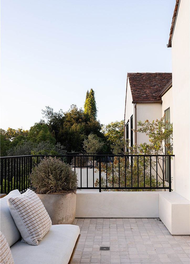 A serene patio space featuring neutral-toned stone tiles underfoot and a cozy cushioned bench, adorned with striped throw pillows in soft beige and white. A large modern planter overflows with greenery beside the seating, adding a natural touch. The iron railing frames the area, offering a sense of enclosure while maintaining open views of lush surrounding trees and manicured landscaping. Crisp white walls of the house contrast with the chocolate brown roof tiles and black window trim, contributing to a clean, elegant, and timeless Mediterranean-inspired aesthetic bathed in gentle natural light.