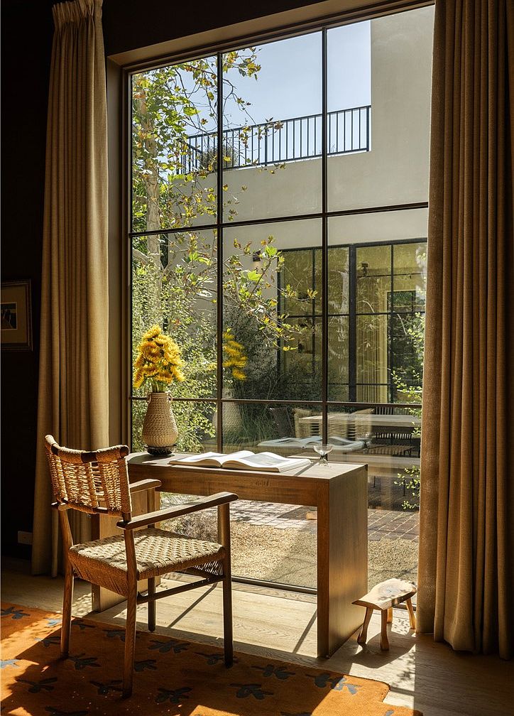 A cozy study nook is arranged in front of a large grid-paned window framed with heavy gold curtains, letting natural sunlight flood the space. A simple, rectangular wooden desk is paired with a woven seat wooden armchair, conveying a warm, rustic aesthetic. An open book and a clear glass rest atop the desk, next to a textured vase filled with yellow flowers. The floor is covered by a soft orange rug with subtle patterns and a small wooden footstool sits beside the desk. Outside, leafy greenery and courtyard brickwork are visible, highlighting the tranquil, indoor-outdoor connection.