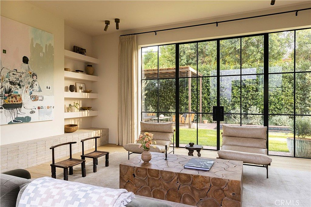 Spacious living room with floor-to-ceiling black-paned windows opening to a lush green garden, flooding the room with natural light. The interior features neutral tones with cream walls and beige curtains, a light taupe area rug, and modern furnishings. Two mid-century chairs face a geometric wooden coffee table holding a simple vase with flowers. Built-in shelves along the left wall display ceramic vases and decor, while a large abstract painting adds visual interest. The design is open and minimalist, blending organic textures and modern lines for a relaxed, elegant atmosphere.