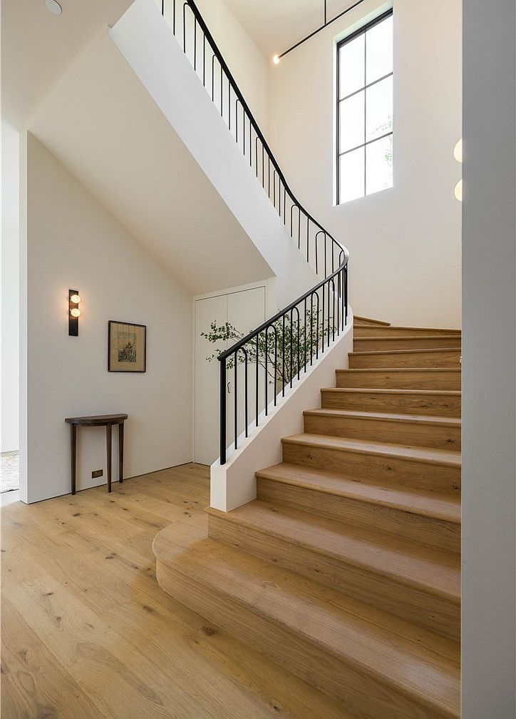 A bright and airy staircase landing with wide, gently curving wooden steps leads to an upper floor. The flooring and stairs are in a light oak finish, complementing the clean white walls. A large, single-pane window fills the space with natural light. The black metal railing adds a touch of modern contrast against the pale hues. Minimal decor includes a framed artwork and a simple wooden table in the corner. Overall, the design is understated, elegant, and modern, with subtle historic touches and an emphasis on spaciousness and natural materials.