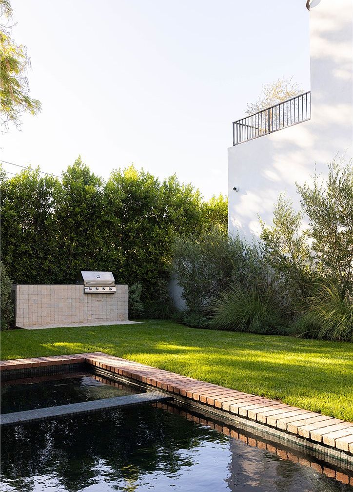 A serene backyard space featuring a rectangular swimming pool bordered by rustic red bricks. The surrounding lawn is lush and meticulously maintained, with ornamental grasses planted neatly along the white stucco exterior wall of the house. At the far edge of the yard, there is a built-in stone grill with a stainless steel finish, set against a backdrop of tall hedges providing privacy and greenery. The crisp, modern lines of the house include a second-story balcony with a black metal railing. The scene is bright and airy with sun casting soft shadows, evoking a relaxed and inviting outdoor lifestyle.