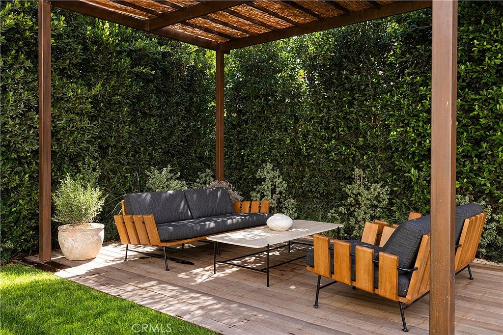A wooden pergola frames a cozy outdoor seating area featuring modern furniture with warm wood frames and deep charcoal cushions. The space centers around a sleek, rectangular stone coffee table topped with a decorative bowl. Lush, leafy hedges enclose the patio, creating a private green backdrop. Potted plants add a touch of freshness at the corners, while sunlight filters through the pergola’s slatted roof, casting patterned shadows on the wood deck. The overall aesthetic merges contemporary comfort with natural textures, inviting relaxation in a serene garden setting.