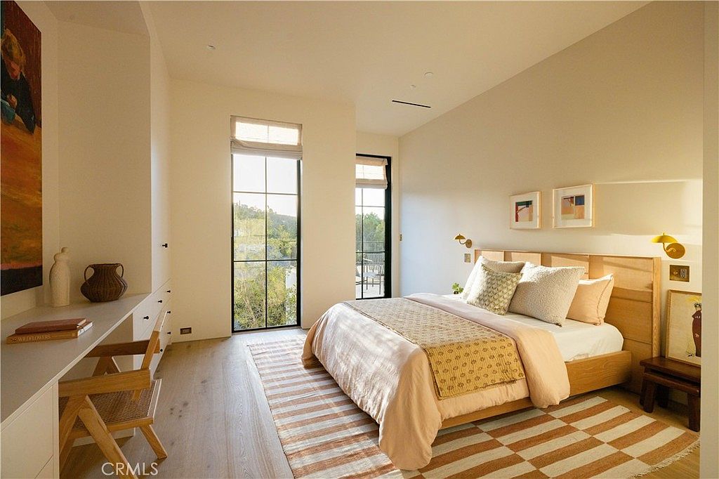 Natural light streams through large black-framed glass doors and windows, brightening a serene bedroom with minimalist decor. A wooden bed with soft neutral bedding and abundant throw pillows sits to the right, flanked by built-in brass reading lights. Above the bed, simple framed artwork hangs on the soft cream wall. Opposite the bed is a sleek white built-in desk, topped with books and pottery, paired with a woven chair. A wide striped area rug in earthy tones covers light wood flooring, while the overall space feels calm and inviting with a restrained palette of creams, beiges, and light woods.