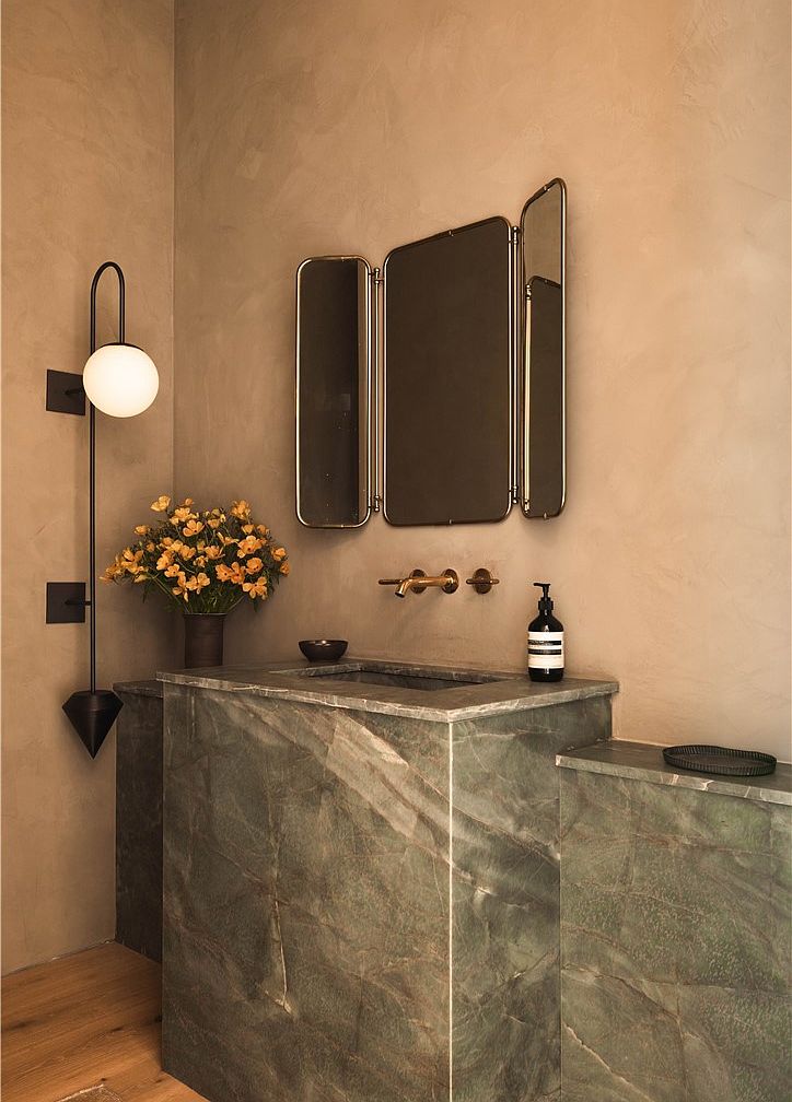 A luxurious bathroom vanity area featuring a rectangular basin crafted from a striking green-hued marble with prominent veining. The walls are finished in a smooth beige plaster that complements the natural stone, creating a calming monochromatic palette. Above the sink is a geometric, three-panel mirror with rounded edges, and below it, sleek brass wall-mounted fixtures enhance the modern yet timeless appeal. On one side, a vase filled with yellow flowers sits atop the counter, introducing a touch of organic color. A matte black sconce with a globe light adds sculptural interest and contemporary flair to the space.