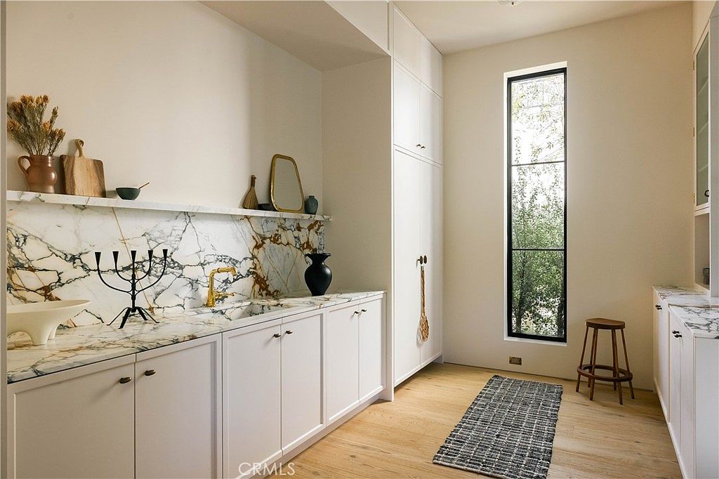 A narrow, elegant butler’s pantry features white cabinetry with sleek hardware and dramatic marble countertops and backsplash with rich, brown-gold veining. A shelf above the counter holds an assemblage of sculptural vases, a candelabra, cutting boards, and dried botanicals, adding a curated, artful touch. Floor-to-ceiling pantry cabinets provide generous storage, while a tall vertical window allows abundant natural light and views of greenery outside. The pale wood floors and soft ivory walls enhance the light, airy atmosphere. A woven runner and a simple wooden stool introduce warmth, blending classic and modern design for a sophisticated yet functional look.