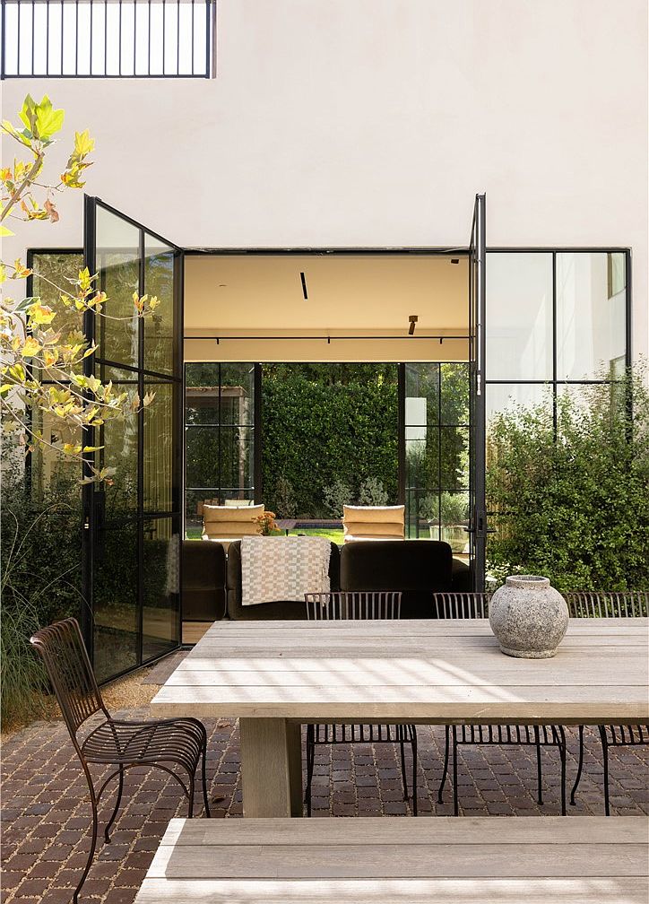 Wide, black-framed glass doors open onto a spacious patio furnished with a sturdy, pale wood picnic table and matching benches. Slender metal chairs surround the table, and a textured ceramic vase serves as a simple centerpiece. The patio floor is constructed from brick laid in a geometric pattern, leading seamlessly to an airy living area inside. Neutral color tones dominate, with soft beige and cream hues on interior walls and furniture. Lush greenery frames the outdoor area and creates a natural, tranquil backdrop visible through the expansive windows, blending indoor and outdoor living spaces harmoniously.