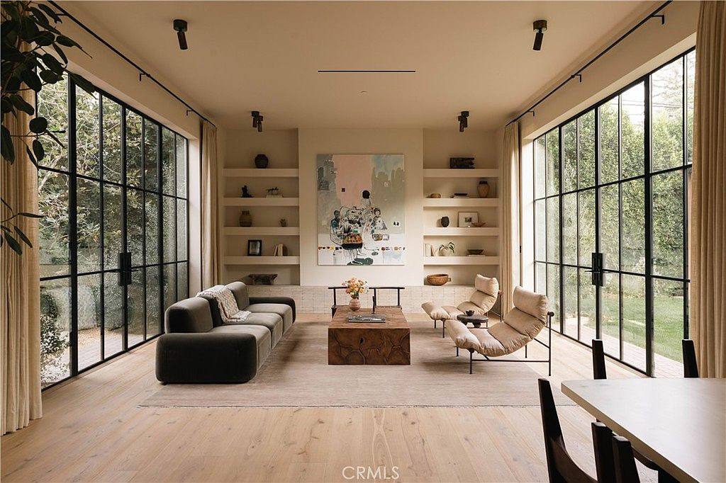 A modern living room with full-height black-frame glass doors on two sides, filling the space with natural light and offering garden views. The space is arranged symmetrically with a large, deep green velvet sofa facing two cream lounge chairs. A geometric wooden coffee table anchors the seating arrangement, sitting atop a soft beige area rug. Built-in shelving frames a central wall adorned with abstract art, holding minimalist decor items such as pottery and books. Blonde wood floors and neutral walls create a calm, airy atmosphere, while soft drapery adds warmth and privacy.