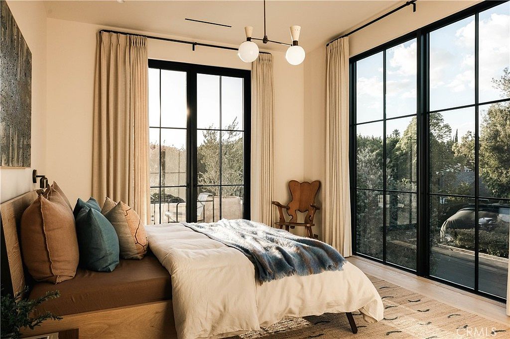 Sunlight pours into a corner bedroom through two walls of tall, black-trimmed windows that offer a sweeping view of trees and sky outside. The decor is minimalist and warm, with neutral beige walls and full-length cream curtains adding softness. A modern wood bed with taupe and teal accent pillows is tucked into one corner, draped in white bedding and a blue throw. A distinctive wooden chair sits in the far corner, giving the space a touch of retro flair. The geometric rug and simple, contemporary light fixture overhead complete the serene and inviting aesthetic.