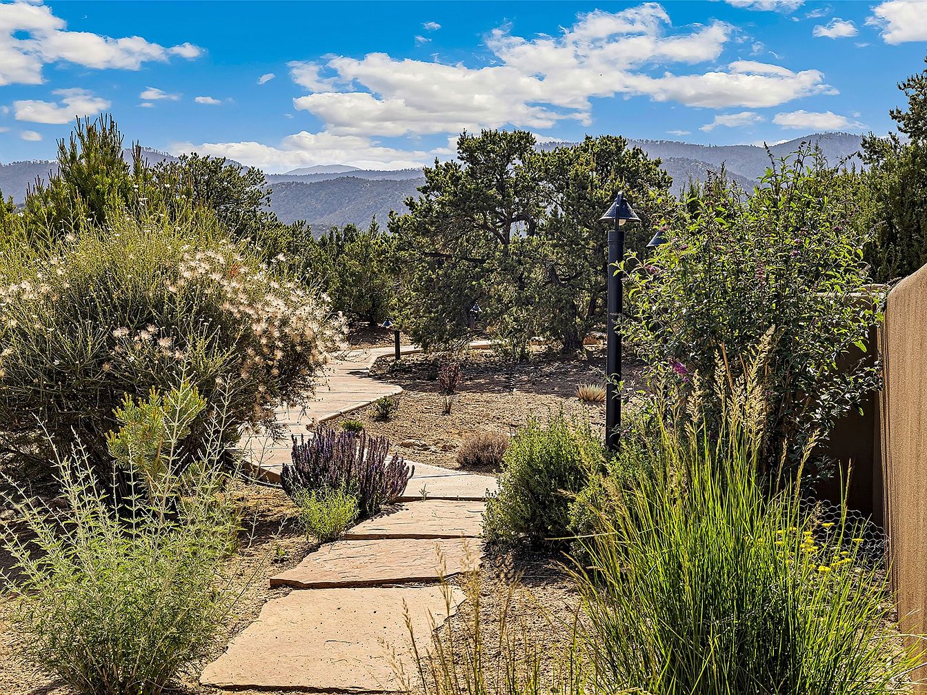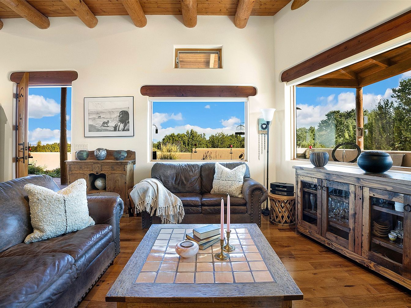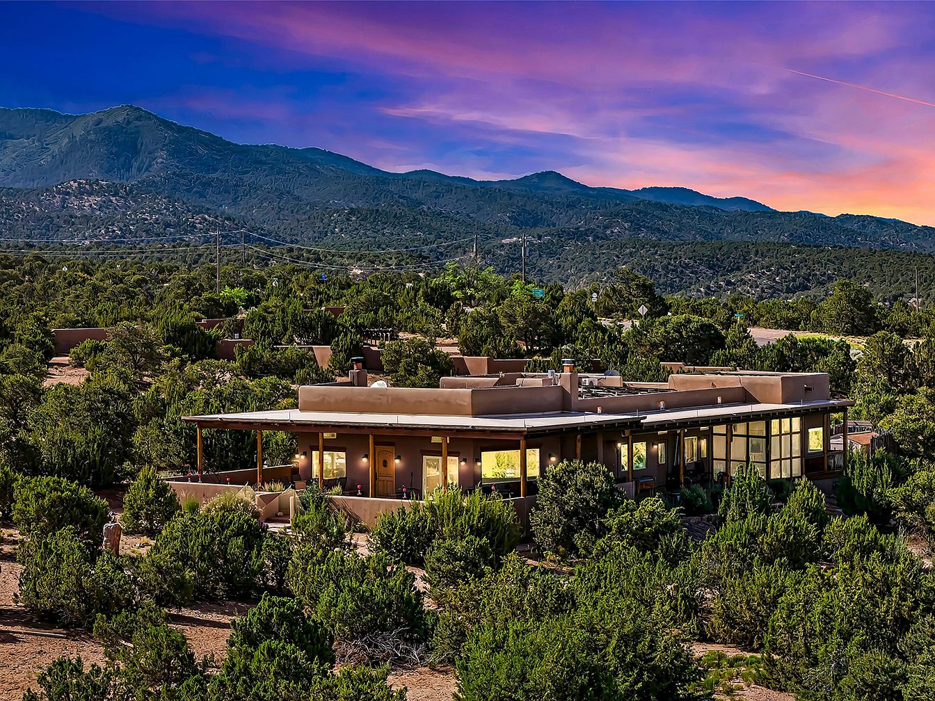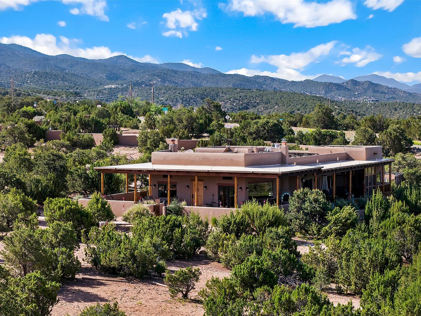 Nestled on a serene 3.5-acre plot in Tesuque, NM, this exceptional home blends Santa Fe architectural elegance with modern sustainability. Built in 2014, it features a single-level layout, boasting 4 bedrooms and 3 bathrooms, high viga-latilla ceilings, and hickory flooring. The home’s panoramic views encompass Santa Fe Baldy and the Jemez range, providing an exquisite backdrop year-round. Recent renovations enhance outdoor living with a wrap-around portal and a walled garden. Priced at $1,895,000, it offers 2,500 sq ft of luxurious space and seclusion while being minutes from local amenities.