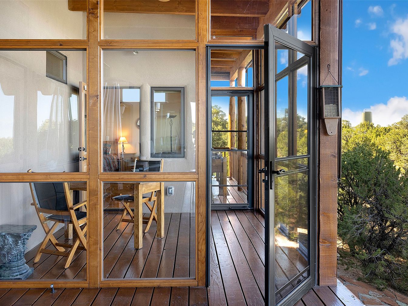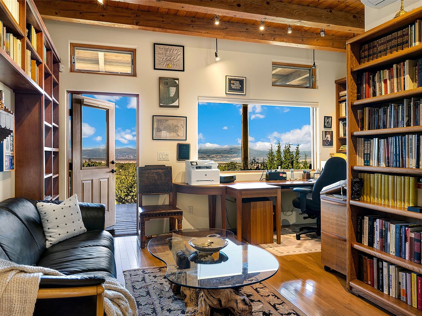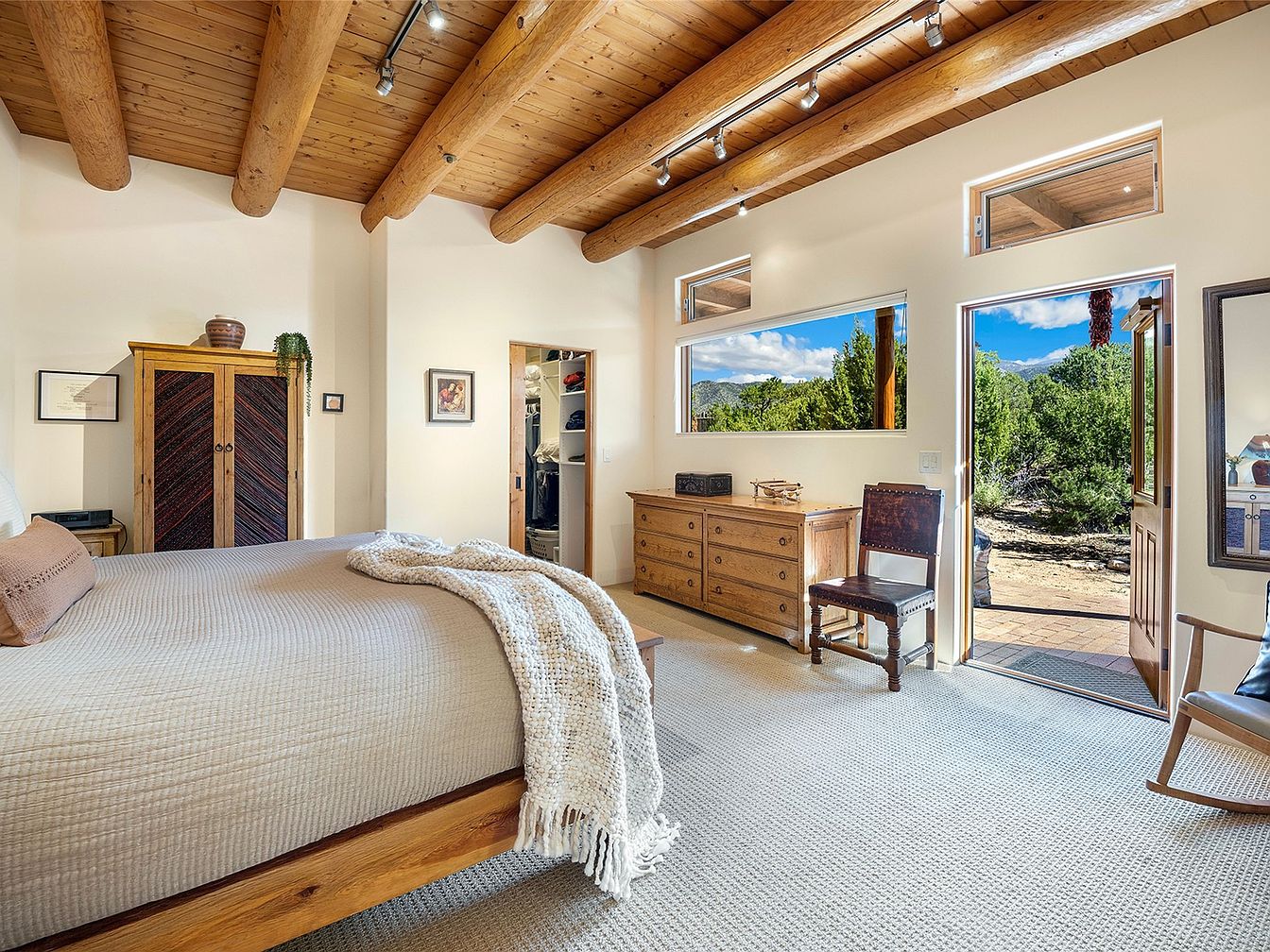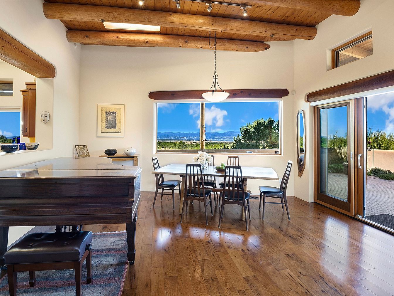 Nestled on a serene 3.5-acre plot in Tesuque, NM, this exceptional home blends Santa Fe architectural elegance with modern sustainability. Built in 2014, it features a single-level layout, boasting 4 bedrooms and 3 bathrooms, high viga-latilla ceilings, and hickory flooring. The home’s panoramic views encompass Santa Fe Baldy and the Jemez range, providing an exquisite backdrop year-round. Recent renovations enhance outdoor living with a wrap-around portal and a walled garden. Priced at $1,895,000, it offers 2,500 sq ft of luxurious space and seclusion while being minutes from local amenities.