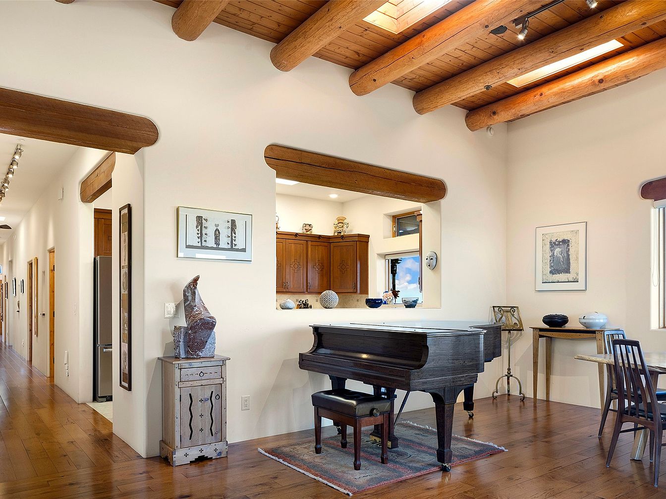 This music room features a grand piano positioned prominently against the wall, inviting creativity and performance. The warm wood tones of the flooring enhance the inviting atmosphere, while the ceiling beams add rustic charm. Natural light filters in through skylights, illuminating the light-colored walls, which showcase framed artwork and tasteful decor. A small decorative cabinet stands beside the piano, adding a touch of elegance with its intricately carved design. A dining table made of wood complements the space, offering a casual gathering spot. Overall, the room blends functionality with artistic expression, perfect for both music and relaxation.