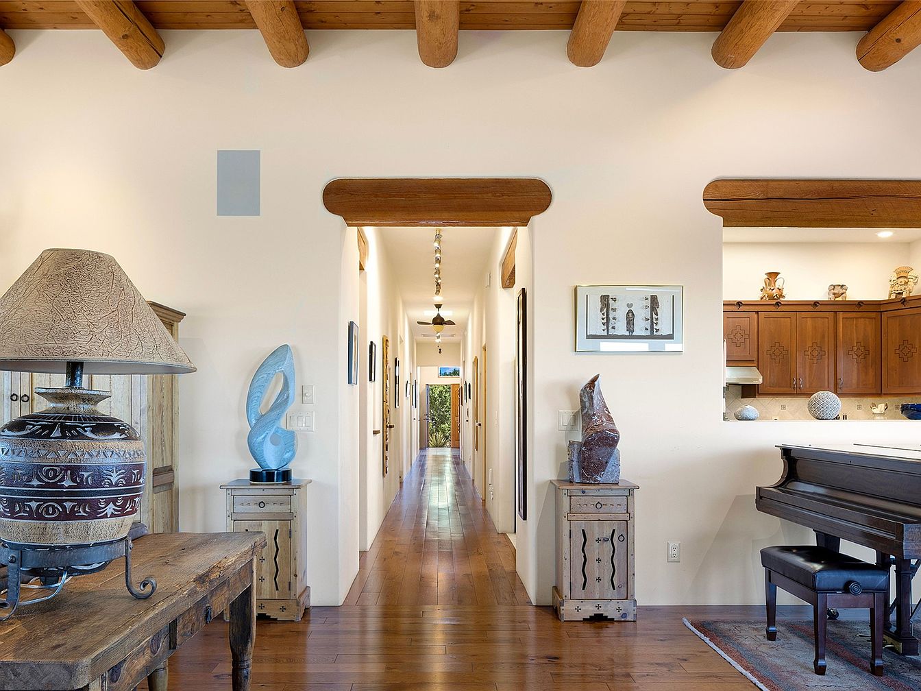 Experience a Stunning 2014 Santa Fe-Style Home in New Mexico with Panoramic Vistas, High Viga-Latilla Ceilings, and Beautifully Landscaped Gardens