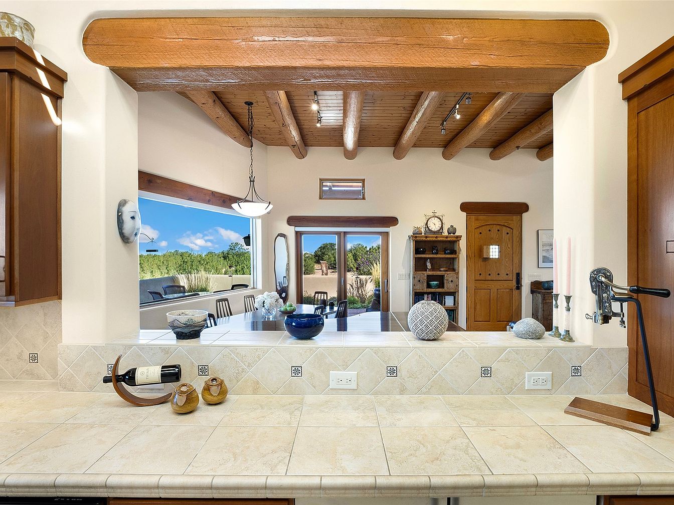 Featuring warm wooden beams and a light color palette, this kitchen exudes a cozy, inviting atmosphere. The tile countertop is elegantly paired with natural stone elements, and a unique wine holder adds charm. Behind the countertop, a spacious dining area is visible, furnished with modern wooden chairs surrounding a dark table. Natural light floods through glass doors, leading to an outdoor space adorned with greenery. Architectural details include a rustic wood door and striking light fixtures, harmonizing traditional and contemporary design. Decorative elements like vases and sculptures contribute to a well-curated, personalized aesthetic.