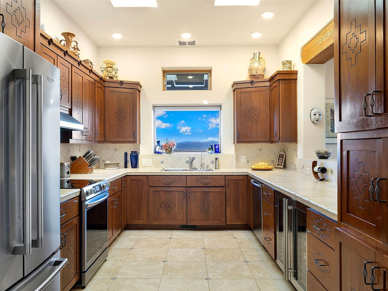 The kitchen features rustic wood cabinetry with intricate, Southwestern-inspired carvings on dark-stained wood. The layout is functional, with a stainless steel refrigerator and oven ensuring modern convenience. A large window offers a scenic outdoor view, complemented by natural light pouring in. Tile countertops are neutral, harmonizing with the warm tones of the wood. The flooring is light-colored tile, enhancing the spacious feel. Decorative items, including pottery and a unique wall mask, add personality and cultural flair. Under-cabinet lighting illuminates the workspace, while overhead recessed lights create a bright, inviting atmosphere perfect for cooking and entertaining.