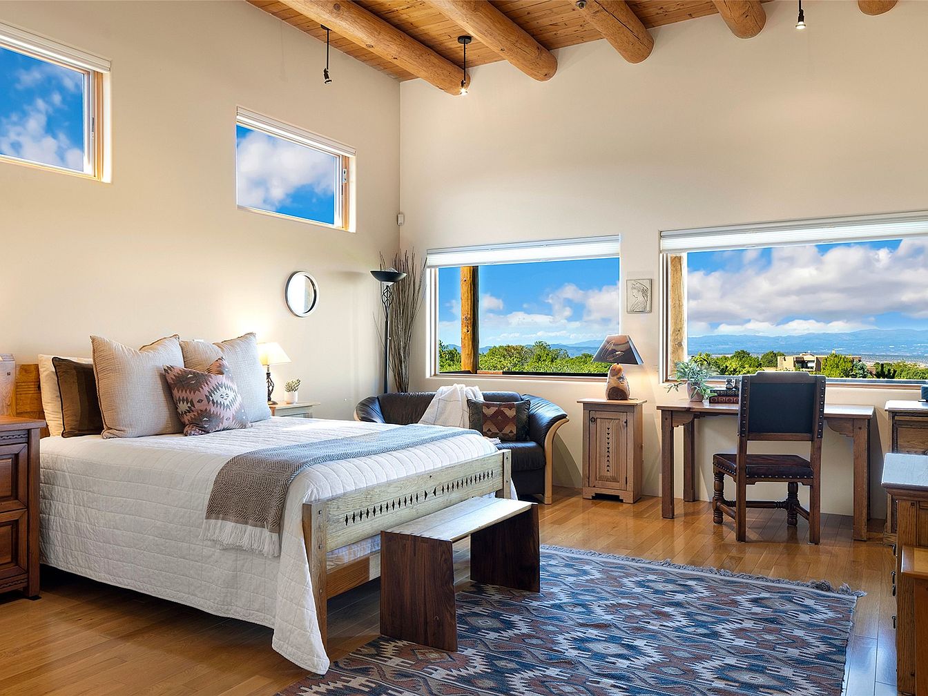 A serene bedroom featuring a low-profile bed with a quilted white coverlet, adorned with textured and patterned pillows. Natural wood elements dominate the space, including exposed beams on the ceiling and rustic wooden furniture. Two modern windows allow plentiful light and frame the scenic outdoor view of green hills under a blue sky. A cozy leather chair complements the room’s natural palette. The hardwood floor is partially covered by a patterned area rug, adding warmth. The walls are painted a light neutral shade, enhancing the sense of spaciousness and tranquility in this inviting retreat.