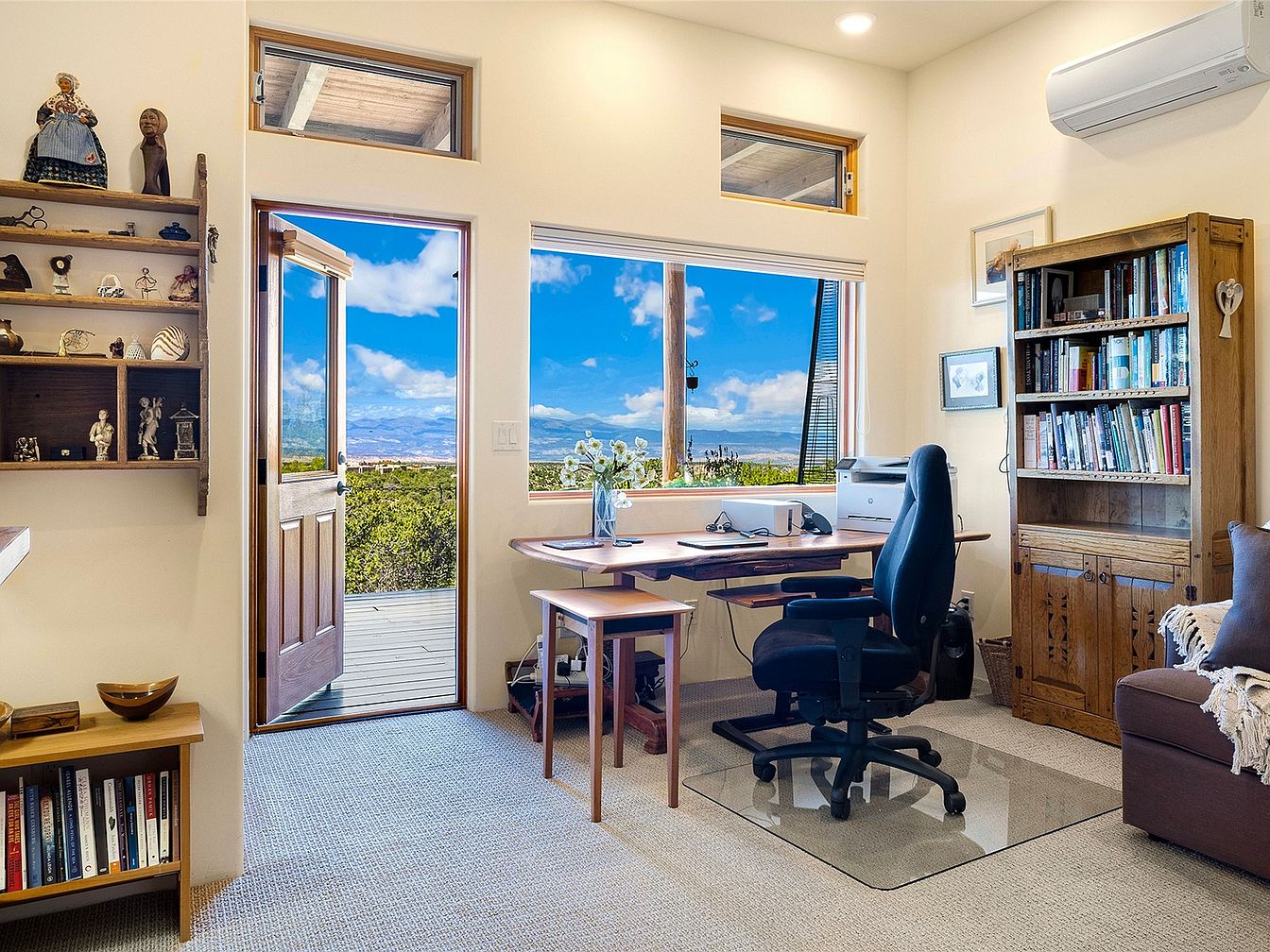 This home office features a bright, airy layout with large windows showcasing stunning views of the landscape. The color palette includes warm neutrals with soft cream walls complementing beige carpeting. A wooden desk paired with a black ergonomic chair creates a functional workspace, while a rustic bookshelf filled with books adds an inviting touch. The entryway includes a wooden door that opens to the outdoors, enhancing the natural light. Decorative items displayed on a wall shelf reflect personal touches, providing character to the room. An air conditioning unit ensures comfort in this serene, productive environment.