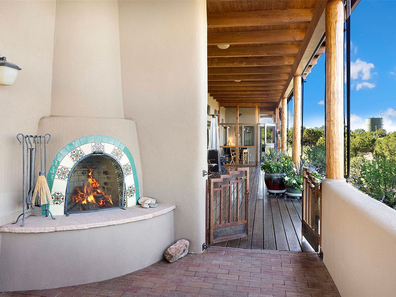 This outdoor patio features a charming adobe-style fireplace with vibrant green and floral tiles encasing the hearth. The warm fire flickers against the smooth beige plaster walls, creating a cozy atmosphere. Exposed wooden beams stretch across the ceiling, enhancing the rustic aesthetic, while large windows invite ample natural light. The floor is laid with rich, warm-toned wooden planks. To the side, a safety gate adds character and safety, while lush potted plants bring life and greenery to the space. The patio is an inviting area for relaxation, blending natural elements with elegant architectural details.