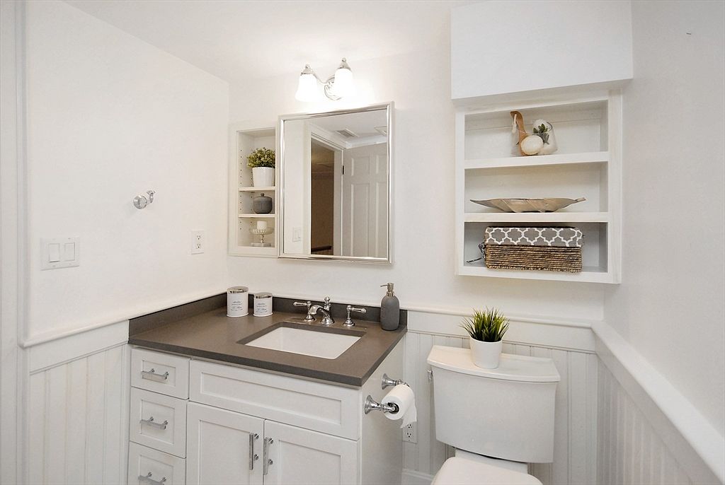 This compact bathroom features a serene aesthetic with a clean, white color scheme. Set against smooth, white walls, a sleek gray countertop supports a modern sink and faucet, reflecting a minimalist approach. Above the sink, an elegant mirror amplifies light, enhancing the spacious feel. Flanking shelves display tasteful decor, including a small potted plant and decorative items, adding warmth. A neatly organized basket on the lower shelf introduces subtle texture. The white wainscoting adds architectural interest, while a stylish towel holder complements the overall design. The toilet is unobtrusive, ensuring functionality within this refined space.