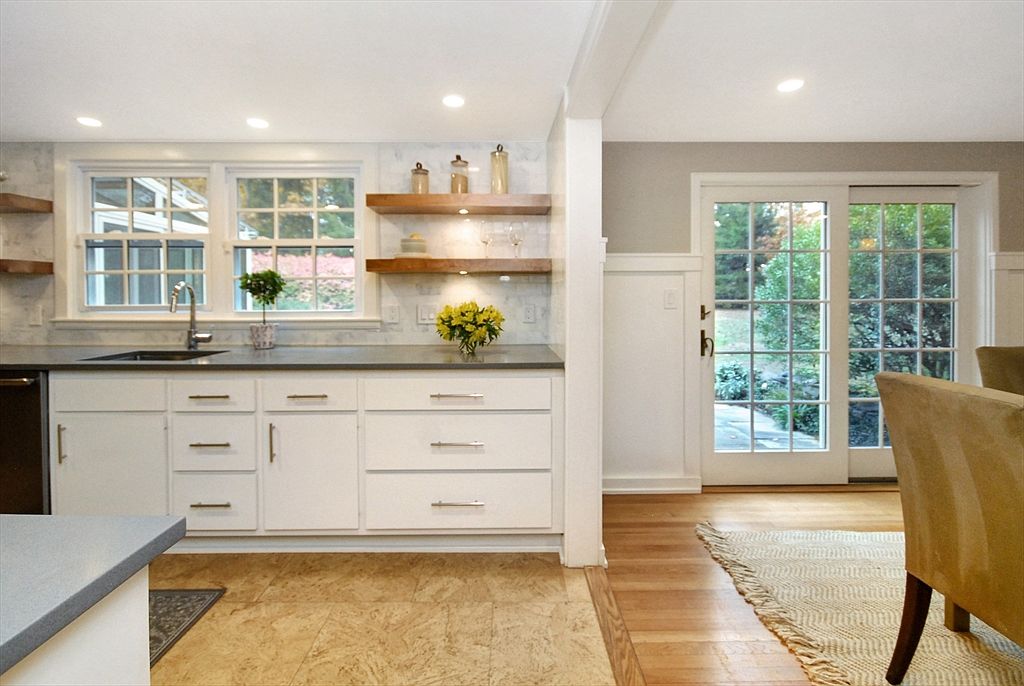 This kitchen showcases a modern yet inviting design with a sleek layout. The walls are painted in a soft gray, contrasting subtly with white cabinetry that features minimalist hardware. A rich, textured countertop complements the cabinetry, providing a sophisticated touch. Open shelving above holds decorative jars and a small plant, adding warmth and personal character. Natural light floods in through large windows, enhancing the airy feel. The proximity of the kitchen to a set of French doors leads to an outdoor space, merging indoor and outdoor living. A neutral-colored rug adds coziness below, suitable for the lively kitchen environment.