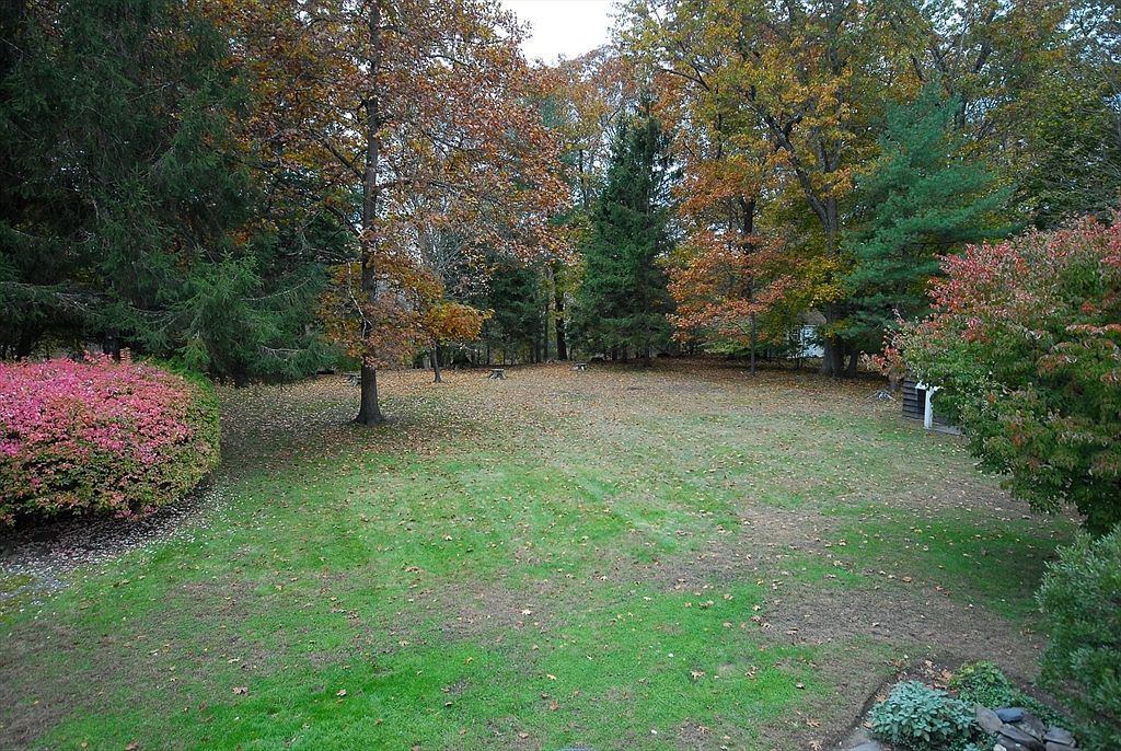 A spacious backyard showcasing a historic home set against a backdrop of tall trees in vibrant autumn colors. The two-story house, painted in a soft yellow, features classic architectural elements such as multi-paneled windows and a welcoming screened porch extending from the side. Adjacent, a charming outbuilding with shingled walls and a small entryway adds to the rustic appeal. The grassy lawn is dotted with fallen leaves, emphasizing the seasonal change. Overall, the scene presents a serene, inviting atmosphere, perfect for outdoor gatherings and relaxation, framed by the beauty of nature.