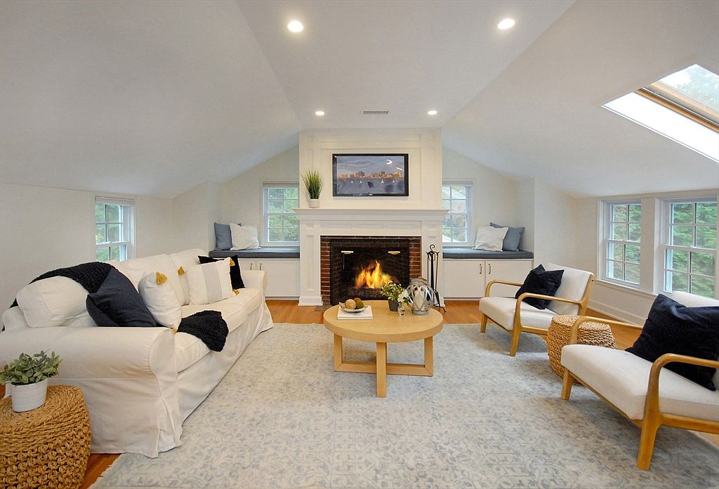 A cozy living room with a classic design features a white sofa adorned with navy and gold accent pillows. A circular wooden coffee table rests on a soft, patterned rug, providing a warm contrast to the polished wooden floor. The fireplace, framed by a white mantle, draws focus, complemented by a modern artwork above it. Natural light floods through multiple windows and a skylight, enhancing the airy feel. Nearby, a built-in bench with plush cushions invites relaxation. Minimalist wooden chairs with curved arms balance the space, creating an inviting atmosphere perfect for gatherings or quiet evenings.