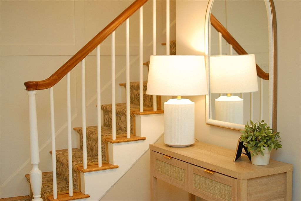 This entryway features a warm and inviting atmosphere marked by a wooden staircase with white balusters leading to an upper level. The soft beige walls enhance the cozy feeling, while a large, round mirror reflects ambient light from a stylish lamp on a console table. The lamp has a textured, white ceramic base and a soft white shade, adding a contemporary touch. The console table blends modern design with natural elements, featuring subtle woven panels. A small potted plant adds a refreshing green accent, completing the space’s harmonious blend of elegance and comfort.