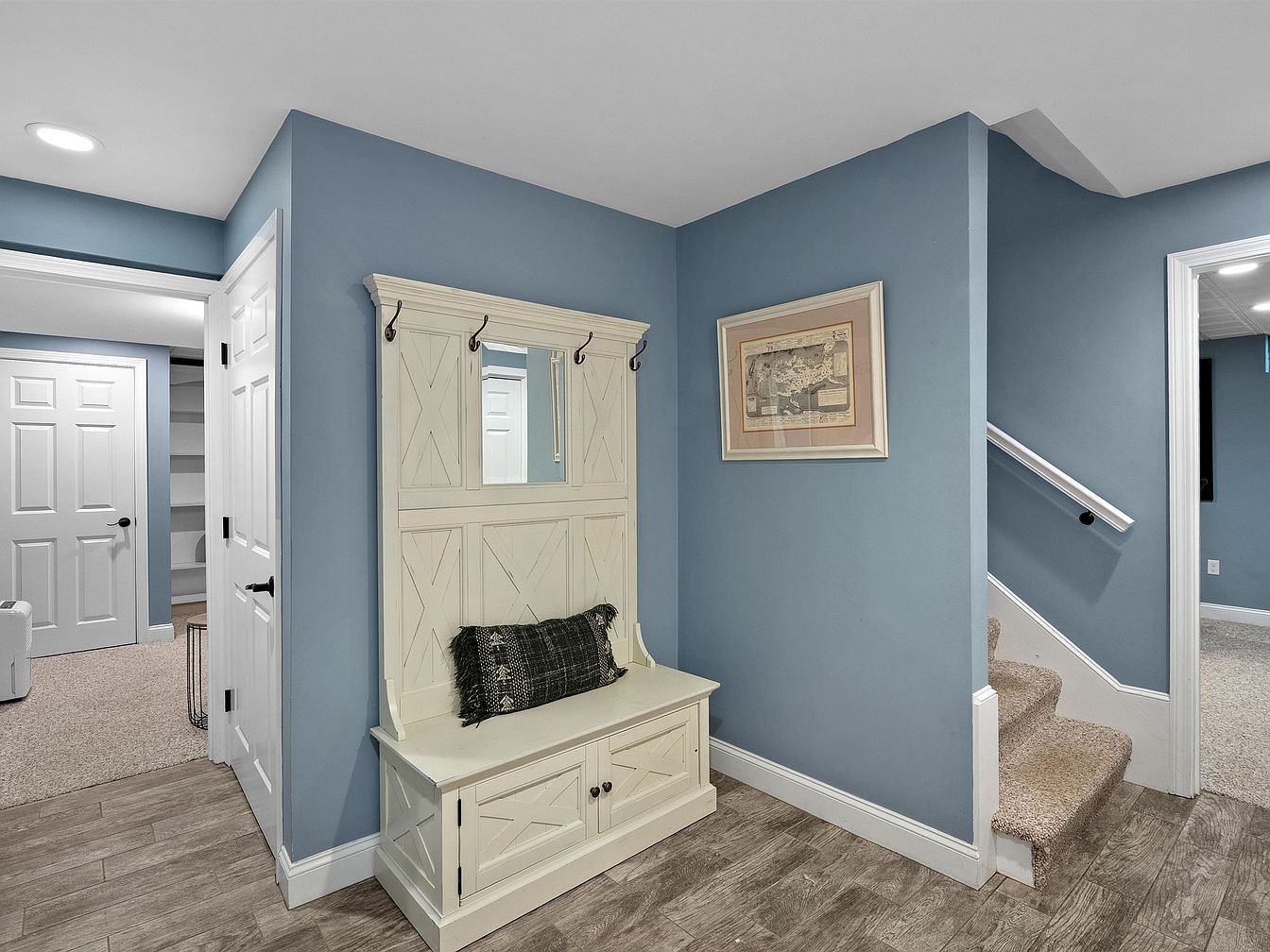 This entryway features a charming entry bench with a white finish, adorned with a dark textured cushion. The walls are painted in a soothing light blue, complemented by the warm wood tones of the flooring. Directly ahead, a staircase leads to the upper level, trimmed with white railings. On one side, a door opens to a closet space, while another door provides access to an adjacent room. A framed map art piece adds character to the wall. Overall, the space blends functionality with a cozy and welcoming ambiance, perfect for greeting guests.