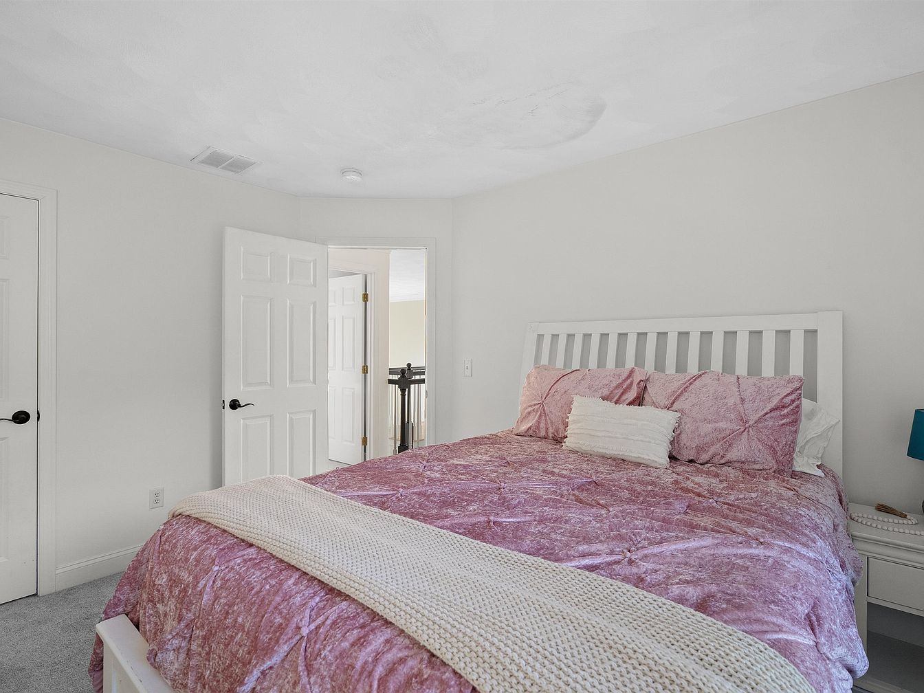 A cozy bedroom features a plush pink bedspread paired with matching pillows, creating a warm, inviting atmosphere. The walls are painted a soft cream, enhancing the room’s brightness. A white wooden bed frame adds a touch of elegance, while a knitted blanket drapes comfortably over the foot of the bed. Two closed doors provide access to nearby spaces, enhancing privacy. A bedside table with a distinctive turquoise lamp introduces a pop of color. Light gray carpet complements the soft color palette, offering comfort underfoot. Overall, this serene space emphasizes tranquility and stylish simplicity.