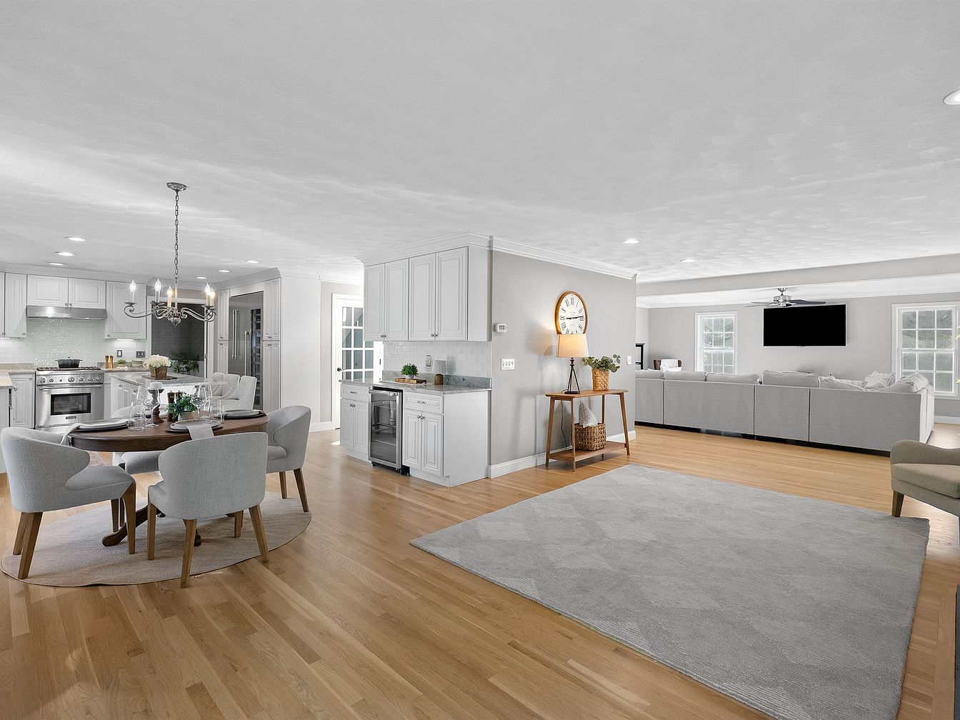 This open layout combines the kitchen, dining, and living areas, creating a seamless flow. The walls are painted in soft gray, enhancing the airy feel. A round wooden dining table, surrounded by plush, light gray chairs, sits centrally, perfect for gathering. The contemporary kitchen features glossy white cabinets, stainless steel appliances, and a large island, providing ample workspace. Natural light floods through multiple windows, illuminating the space. A cozy seating area boasts a large sectional couch in muted tones, complemented by a decorative lamp and a simple wall clock, harmonizing modern aesthetics with comfort.