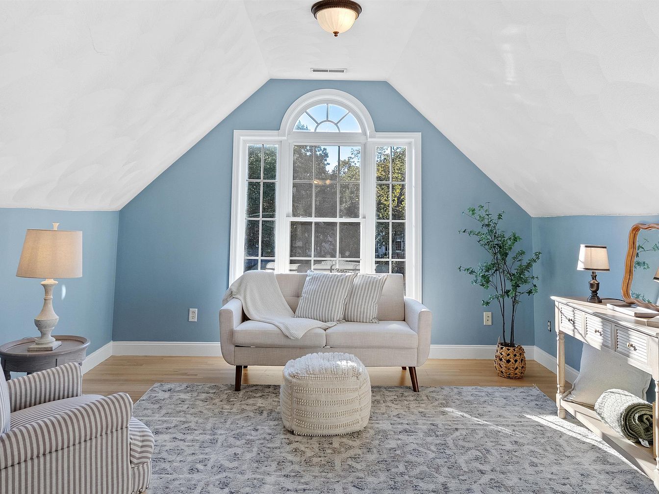 A cozy attic space featuring sloped ceilings and a soft color palette of light blue and white. The main area includes a light gray sofa adorned with plush throw pillows and a textured blanket, paired with a matching knitted pouf for additional seating. A classic cream area rug with subtle patterns anchors the space. Adjacent to the sofa, a small side table supports a simple lamp, illuminating the room’s warmth. Large windows bathe the room in natural light, framed by delicate greenery. A vintage console with decorative items adds charm, enhancing the inviting atmosphere perfect for relaxation or reading.