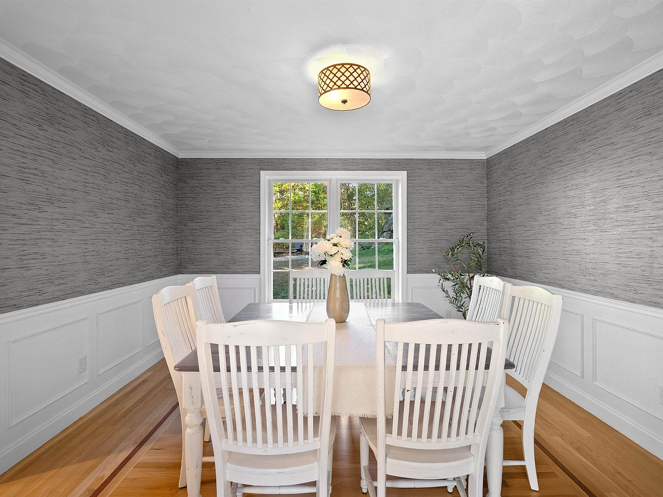 The dining room features a large rectangular table set at the center, surrounded by six classic white slat-back chairs, enhancing a casual yet elegant atmosphere. The walls are adorned with textured gray wallpaper, offering a modern twist complemented by timeless white wainscoting. A subtle pendant light with a geometric design hangs from the ceiling, casting soft illumination throughout the space. Large windows frame a view of the greenery outside, creating a bright and inviting environment. Natural wood flooring adds warmth, grounding the room in a cozy yet sophisticated aesthetic. A slender vase with fresh flowers serves as a simple centerpiece.