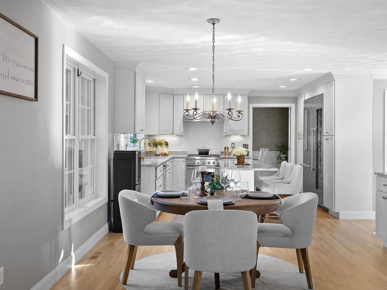 A cozy dining area features a round wooden table surrounded by plush, light gray chairs, enhancing comfort and inviting gatherings. The flooring is a warm wood tone that complements the soft gray walls, creating a harmonious color scheme. Natural light streams through a nearby window, accentuating the space. A chic chandelier with multiple bulbs hangs above the table, adding elegance. The kitchen’s white cabinetry and sleek countertops are visible in the background, showcasing a modern design. Subtle ornamental details, like a potted plant and decorative table settings, contribute to an inviting and stylish atmosphere, ideal for meals and conversations.