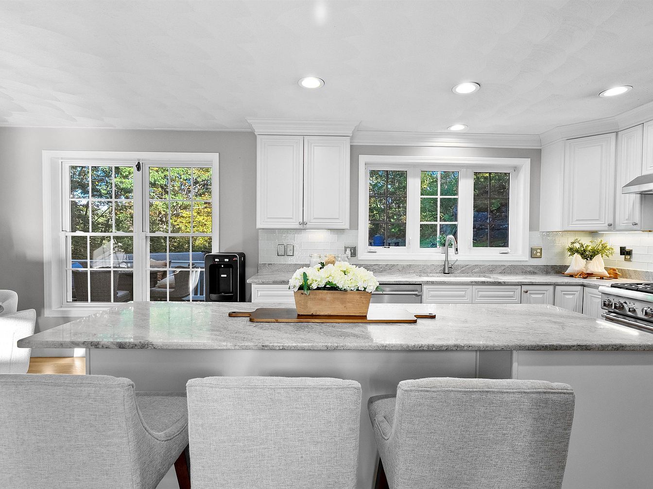 A spacious kitchen showcasing a sleek, modern design with white cabinetry and grey granite countertops. The color palette combines soft whites and greys, creating an airy atmosphere. Barstools with light grey upholstery are positioned at the countertop, inviting casual dining. Natural light floods the space through large, gridded windows, offering views of the greenery outside. A stainless steel stove and a polished sink are focal points, with subtle mosaic tiles adding texture. A wooden tray with fresh flowers enhances the decor, while recessed lighting contributes to a warm, welcoming ambiance throughout the room.