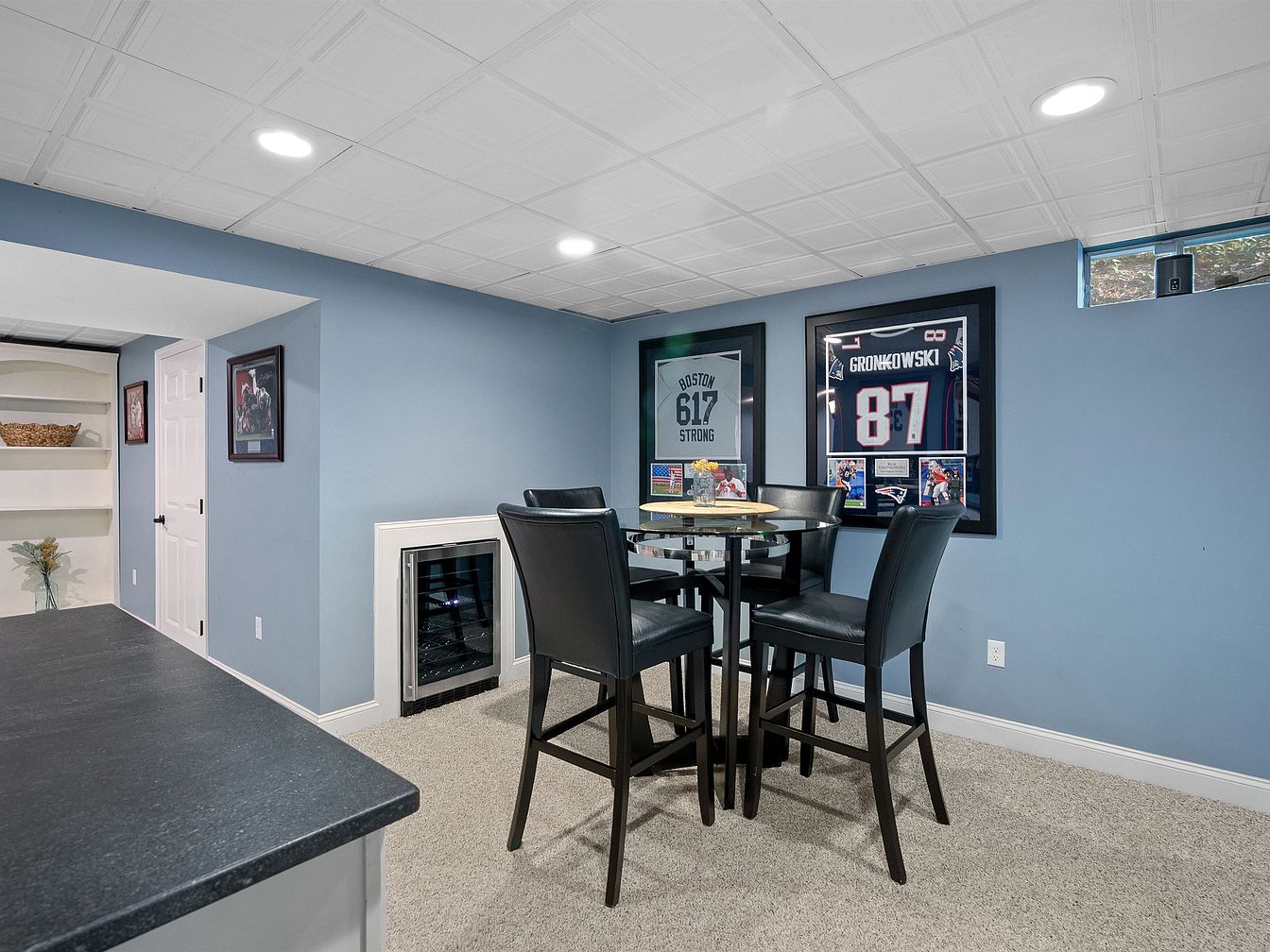 This recreation room features a relaxing atmosphere with a soft blue wall color that enhances the spacious feel. The room includes a small round table surrounded by four high-backed black chairs, ideal for casual gatherings. A sleek black countertop extends from the adjacent area, complementing the subtle tones of the furniture. Framed sports jerseys adorn the walls, adding a personal touch and a sense of team spirit. A built-in electric fireplace offers warmth and ambiance, while a shelf displays decorative elements. Natural light filters through a nearby window, contributing to the inviting charm of the space.