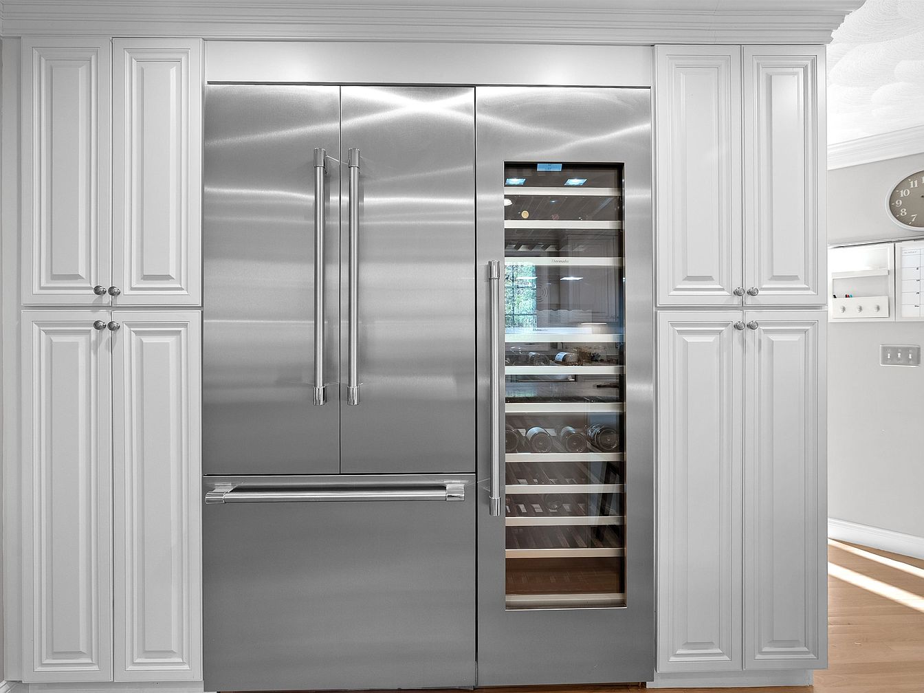 A modern kitchen area showcases a sleek, stainless steel refrigerator paired with a wine cooler, set against a backdrop of elegant white cabinetry. The refrigerator features large double doors with minimalist handles, providing a striking contrast to the ornate, embossed panels of adjacent cabinets. A polished chrome finish enhances the contemporary vibe, while the cabinetry is detailed with classic trim molding for a timeless appeal. Natural light filters in, highlighting the warm tones of the wooden floor, creating a welcoming atmosphere. Simple yet refined, this space merges functionality with sophistication, perfect for a modern culinary experience.