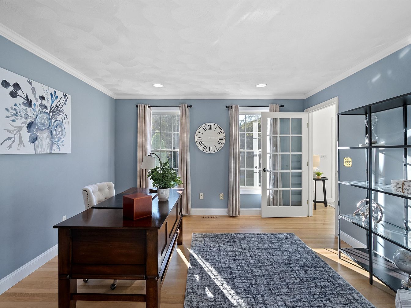 A tranquil home office features a blend of functional design and soft aesthetics. A deep blue wall provides a calming backdrop, highlighted by a floral artwork that introduces subtle color. The room is illuminated by natural light streaming through large windows, complemented by curtains that soften the overall look. A rich wooden desk adds warmth, paired with an elegant tufted chair. On the desk, a plant adds vitality alongside a wooden box. A stylish open shelf stands across the room, showcasing decorative objects. The light hardwood floor contributes to an inviting atmosphere, enhancing the overall spacious feel.