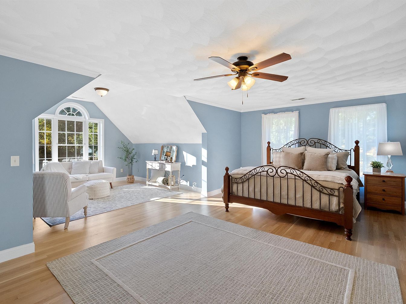 The spacious bedroom features a soothing blue color scheme that creates a tranquil atmosphere. A striking iron bed frame with soft, neutral bedding takes center stage, complemented by a rich wooden nightstand. Natural light floods in through large windows, accentuated by sheer white curtains. A cozy seating area invites relaxation, consisting of a striped armchair and an ottoman atop a plush area rug. A small side table displays decorative items, adding charm. The room’s vaulted ceiling with textured finish enhances its openness, while elegant wooden flooring adds warmth, making this space both inviting and stylish.