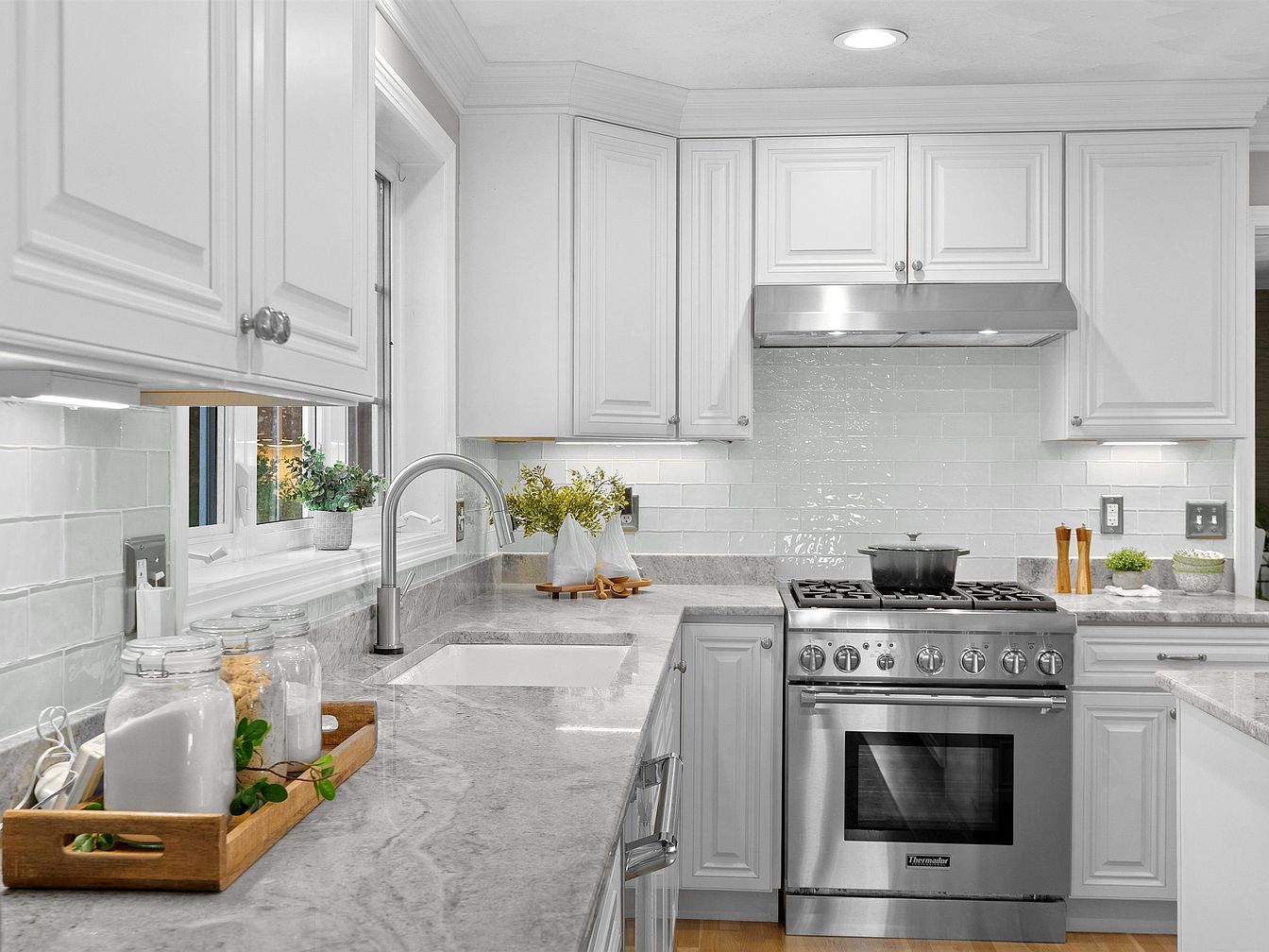 This modern kitchen features elegant white cabinetry with detailed paneling and chrome hardware, creating a bright and airy atmosphere. The marble countertop complements the sleek stainless steel appliances, including a professional-grade gas stove and a stylish faucet. A subtle backsplash with glossy subway tiles adds texture, while natural light floods in through a window adorned with lush green plants. A wooden tray organized with glass jars offers practical storage, enhancing the design with a rustic touch. The layout promotes efficiency, making it inviting for cooking and social gatherings in a beautifully cohesive space.