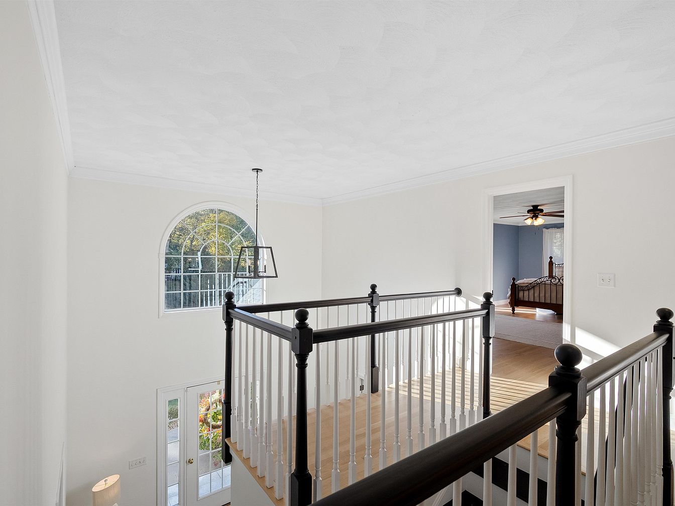 This upper landing showcases a spacious, light-filled area with a striking view of the exterior through a large arched window. The walls feature a soft, neutral white tone, enhancing the sense of space. A modern pendant light hangs elegantly from the ceiling, adding a contemporary touch. The elegant black and white balustrade leads to different rooms, contrasting beautifully with the light hardwood floor. To the side, a doorway opens into a bedroom, revealing a blue hue that adds warmth to the overall aesthetic. The atmosphere feels inviting, blending classic architecture with modern design elements.