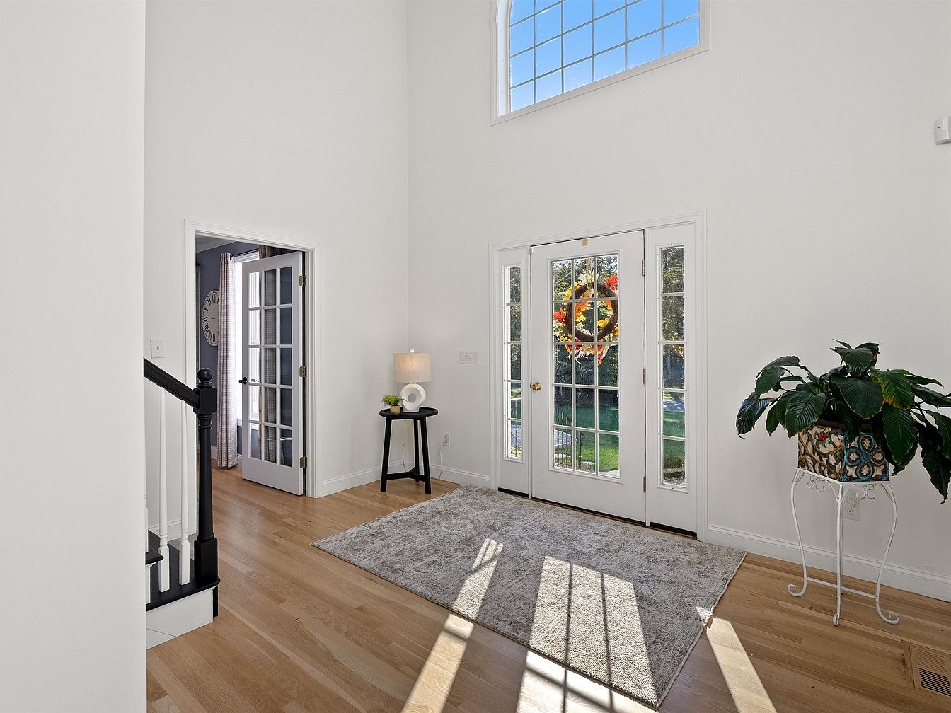 The entryway features high, vaulted ceilings and large windows allowing natural light to flood the space. A double door with glass panes opens to the outdoors, adorned with a seasonal wreath. Warm wooden flooring enhances the inviting atmosphere, complemented by a soft area rug beneath a small side table holding a lamp and decorative accessories. To the right, French doors lead into a further room, while a simple staircase with black railings frames the space. A green potted plant adds a touch of nature, contrasting with the bright, white walls and bringing freshness to the modern, minimalist design.