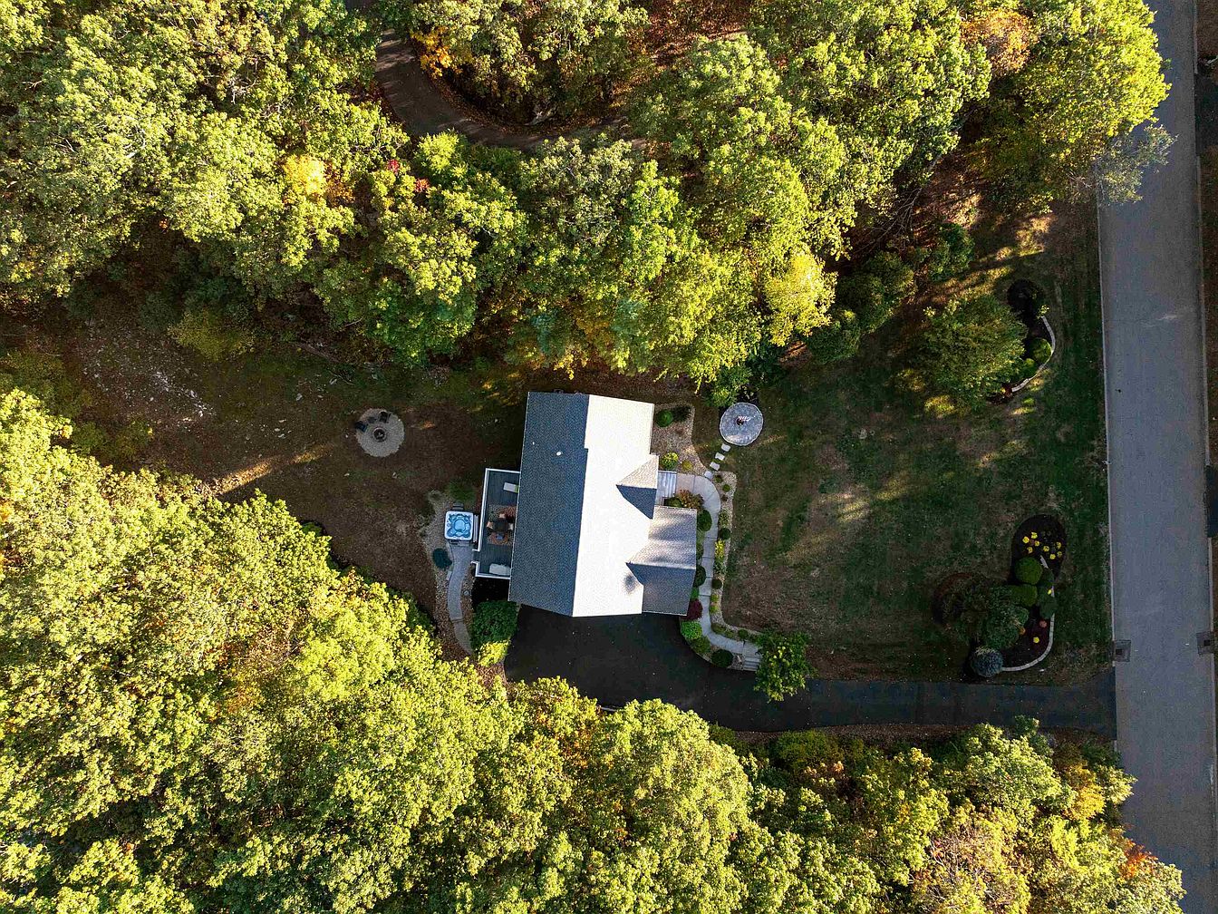 An overhead view of a historic American home surrounded by lush greenery. The house features a sloped roof and a light-colored exterior, blending seamlessly with its natural surroundings. A winding driveway leads to the home, showcasing a well-manicured lawn flanked by colorful flower beds. To the side, there’s a patio area with a fire pit, inviting outdoor gatherings. Tall trees provide shade and a sense of privacy, enhancing the tranquil vibe. The scene captures the harmony between the residential space and its wooded backdrop, emphasizing the beauty of nature’s envelope around the property.