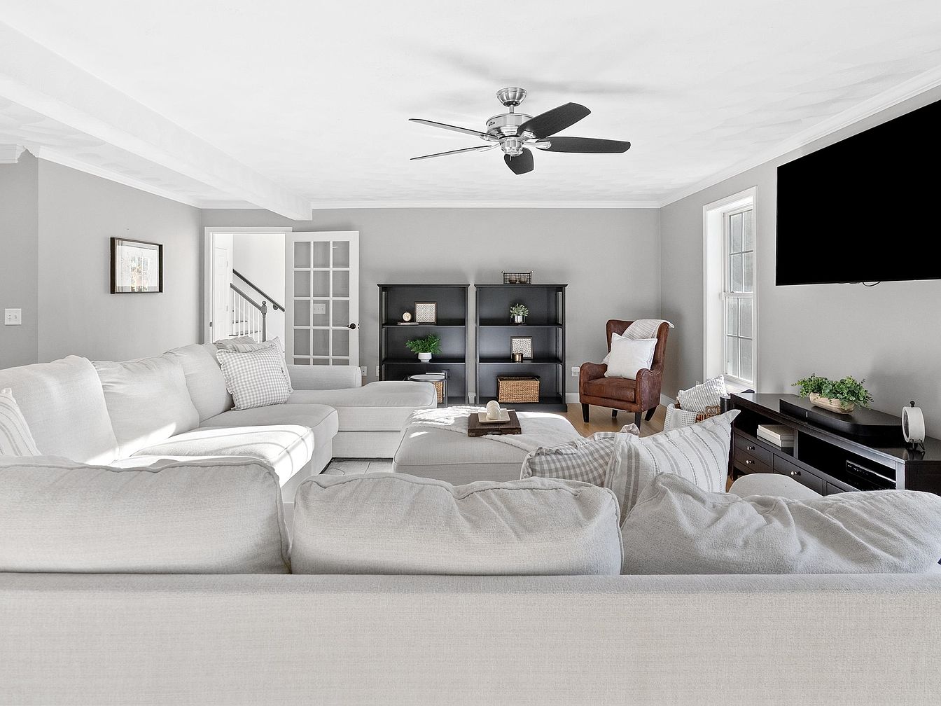 A spacious living room features a light grey color scheme that enhances openness. A large, plush sectional sofa in white is peppered with patterned throw pillows, inviting comfort. Opposite the sofa, a dark wooden entertainment unit with a flat-screen TV presents a contrasting focal point. A brown leather armchair adds warmth and an inviting touch, positioned near a modern shelving unit that holds decorative plants and storage baskets. Natural light floods in through the windows adjacent, highlighting the textured ceiling and creating a cozy ambiance. The design balances modern simplicity with warm, inviting elements.