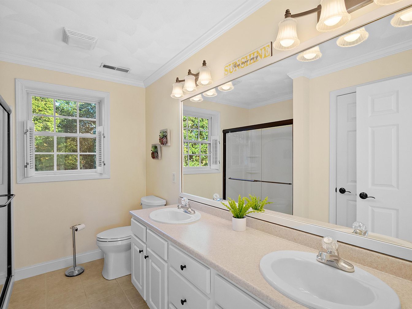A serene bathroom space featuring a light yellow color palette that enhances brightness. The layout includes dual sinks with white cabinetry, offering ample storage. Above the sinks, a row of elegant light fixtures illuminates the mirror, accentuating the smooth surface of the countertop. To the left, a clear glass shower enclosure allows for a view of tiled interiors, while a classic white toilet sits nearby. Natural light streams in through two double-hung windows, framed with white trim, providing a refreshing ambiance and a glimpse of greenery outside. Decorative wall accents add a subtle touch of personalization.