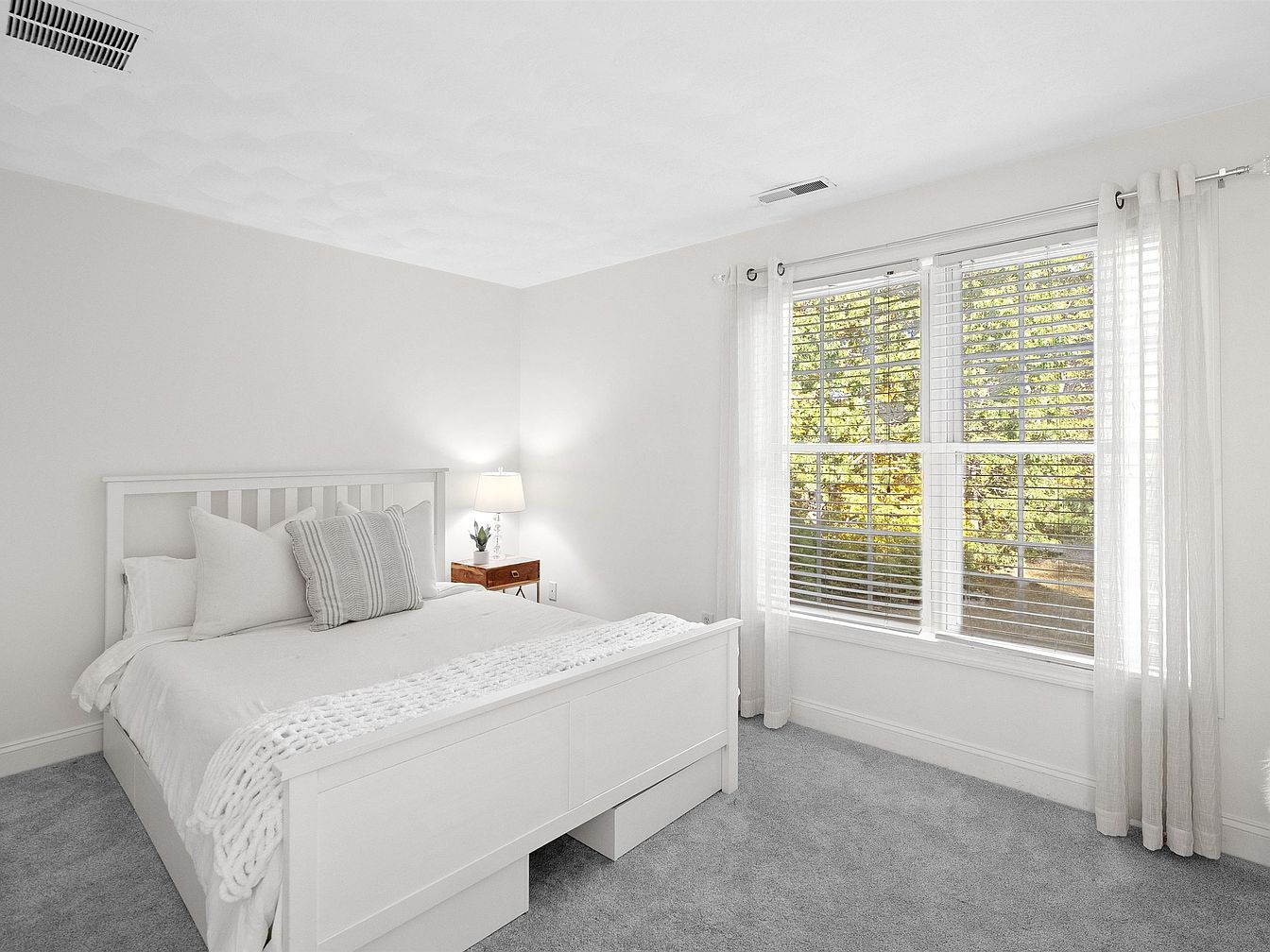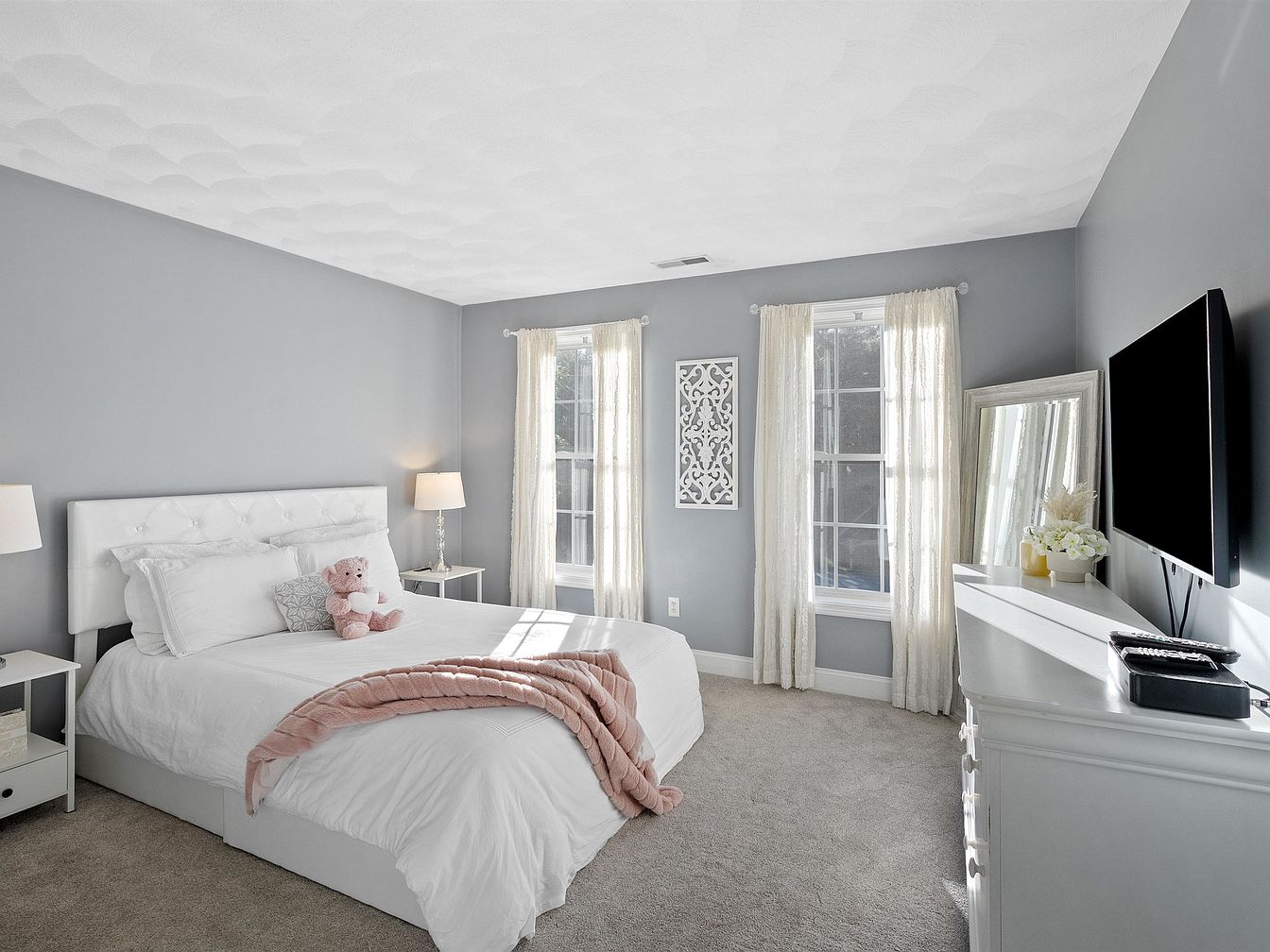 A tranquil bedroom features soft gray walls and plush carpeting, creating a cozy atmosphere. The spacious bed, adorned with a white tufted headboard and crisp white linens, is accented by a pale pink throw. Flanking the bed are white nightstands, each topped with elegant lamps that emit a warm glow. Large windows are dressed with sheer, light curtains, allowing natural light to flood the room. A modern mirror and a delicate floral arrangement add a touch of sophistication. The sleek dresser complements the overall design, while subtle decorative details enhance the inviting and restful ambiance.
