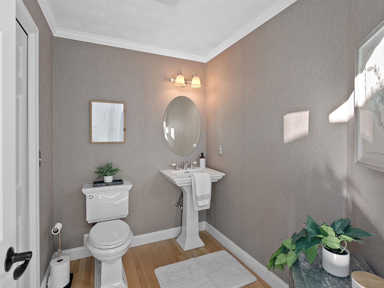 This compact bathroom features a soothing color palette of muted taupe on the walls, enhanced by minimalist decor. A circular mirror above a pedestal sink reflects light from wall-mounted lamps, illuminating the polished surface. A decorative framed botanical print adds a touch of sophistication. The room is anchored by light-colored wooden flooring, complemented by a plush white bath mat. A small potted plant offers a hint of greenery on the sink, while another plant rests on a subtle blue console table, creating an inviting ambiance. The design emphasizes cleanliness and elegance in a limited space.
