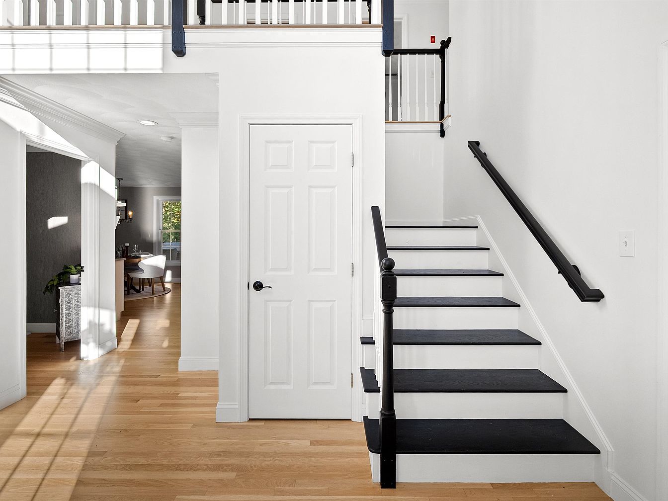 The entryway features a spacious and inviting layout, with natural light filtering through the upper floor’s railing. A blend of hardwood and painted surfaces creates a warm yet modern aesthetic. The stairs, adorned with black treads and white risers, lead to the upper level, while a polished white door offers access to an adjacent room. Textured walls in soft gray add subtle elegance. Recessed lighting enhances the airy feel, while long shadows cast on the floor highlight the smooth grain of the light wood. A side table with decorative elements adds a touch of character and style.